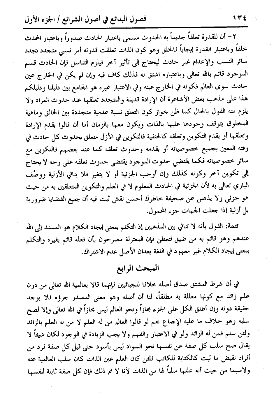 في أن شرط المشتق صدق أصله خلافا للجبائين فإنهما قالا بعالمية الله تعالى من دون علم زائد مع كونها معللة به مطلقًا، لنا أن أصله وهو معنى المصدر جزؤه فلا يوجد حقيقة دونه وإن أطلق الكل على الجزء مجازًا ونحو العالم ليس مجازًا في الله تعالى وإلا لصح سلبه وهو خلاف ما عليه الإجماع نعم لو قالوا العالم من له العلم لا من له العلم بالزائد ولئن سلم فمن له الزائد ولو في الاعتبار والفهم ولا يجب الزيادة في الوجود لكان شيئًا لا يقال صح سلب كل صفة عن نفسها نحو السواد ليس بأسود حتى قيل كل صفة فرد من أفراد نقيض ما ثبت كالكتابة للكاتب فلئن كان العلم عين الذات كان سلب العالمية عنه ولا سيما من حيث أنه علتها سلبًا لها من الذات لأنا لا نم ذلك فإن كل صفة ثابتة لنفسها
