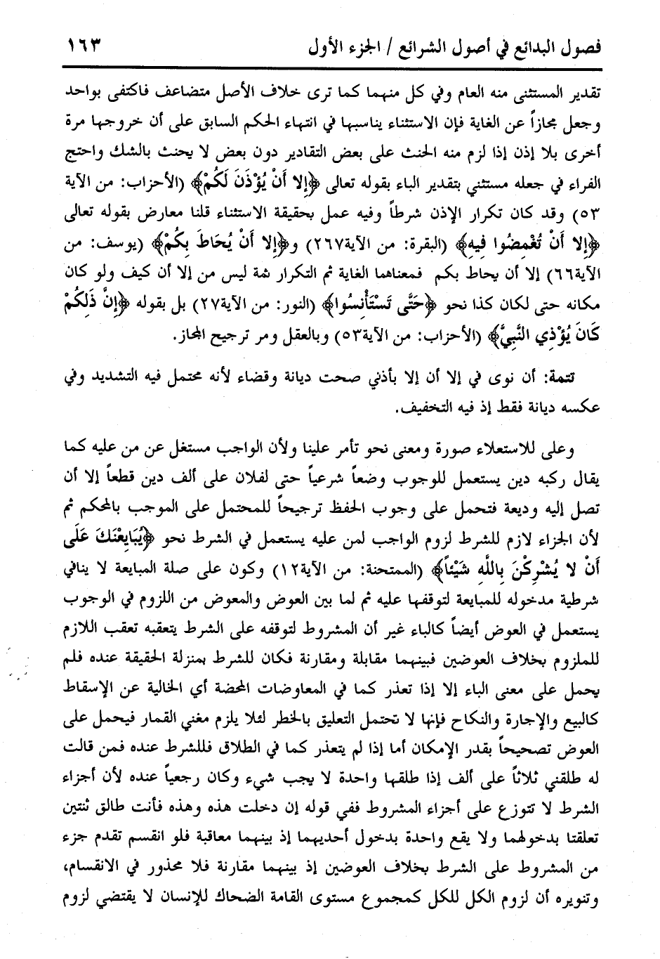تقدير المستثنى منه العام وفي كل منهما كما ترى خلاف الأصل متضاعف فاكتفى بواحد وجعل مجازًا عن الغاية فإن الاستثناء يناسبها في انتهاء الحكم السابق على أن خروجها مرة أخرى بلا إذن إذا لزم منه الحنث على بعض التقادير دون بعض لا يحنث بالشك واحتج الفراء في جعله مستثني بتقدير الباء بقوله تعالى {إِلا أَنْ يُؤْذَنَ لَكُمْ} (الأحزاب: من الآية 53) وقد كان تكرار الإذن شرطًا وفيه عمل بحقيقة الاستثناء قلنا معارض بقوله تعالى {إِلا أَنْ تُغْمضُوا فِيه} (البقرة: من الآية 267) و {إِلا أَنْ يُحَاطَ بِكُمْ} (يوسف: من الآية 66) الاَ أن يحاطَ بكم فمعناهما الغاية ثم التكرار ثمة ليس من إلا أن كيف ولو كان مكانه حتى لكان كذا نحو {حَتَّى تَستَأنِسُوا} (النور: من الآية 27) بل بقوله {إِن ذَلِكُمْ كَانَ يُوذِي النَّبِيَّ} (الأحزاب: من الآية 53) وبالعقل ومر ترجيح المجاز.