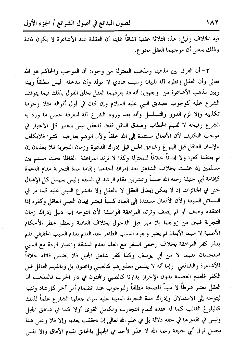 3 - أن الفرق بين مذهبنا ومذهب المعتزلة من وجوه: أن الموجب والحاكم هو الله تعالى وأن العقل ونظره آلة للبيان وسبب عادي لا مولد وأن مدخله ليس مطلقًا وبينه وبين مذهب الأشاعرة من وجهين: أنه قد يعرفهما العقل بخلق القول بذلك فيما يتوقف الشرع عليه كوجوب تصديق النبي عليه السلام وإن كان في أول أقواله مثلا وحرمة تكذيبه وإلا لزم الدور والتسلسل وأنه بعد ورود الشرع آلة لمعرفة حسن ما ورد به الشرع وقبحه لا لفهم الخطاب وصدق الناقل فقط فالعقل ليس بمعتبر كل الاعتبار في موجب التكليف لأن الأفعال مستندة إلى الله خلقًا ولأن الوهم بعارضه كثيرا فلا يكلف بالإيمان العاقل قبل البلوغ وشاهق الجبل قبل إدراك الدعوة وزمان التجربة فلا يعذبان إن لم يعتقدا كفرا ولا إيمانًا خلافًا للمعتزلة وكذا لا ترتد المراهقة الغافلة تحت مسلم بين مسلمين إذا عقلت بخلاف الشاهق بعد إدراك أحدهما وإقامة مدة التجربة مقام الدعوة كإقامة أبي حنيفة رحمه الله خمسًا وعشرين مقام الرشد في السفه وليس بمهمل كل الإهمال حتى في الجائزات إذ لا يمكن إبطال العقل لا بالعقل ولا بالشرع المبني عليه كما مر في المسائل السبعة ولأن الأفعال مستندة إلى العباد كسبًا فيعتبر إيمان الصبي العاقل وكفره إذا اعتقده وصف أو لم يصف وترتد المراهقة الواصفة لأن التوجه إليه دليل إدراك زمان التجربة فنيين من زوجها بلا مهر قبل الدخول بخلاف الغافلة ولعظم خطر الأحكام الأصلية لا سيما الأيمان لم يعتبر وجود السبب الظاهر عند العلم بعدم السبب الحقيقي فلم يعذر كفر المراهقة بخلاف رخص السفر مع العلم بعدم المشقة واعتبار الردة مع السبي استحسان منهما لا من أبي يوسف وكذا كفر شاهق الجبل فلا يضمن قاتله خلافًا للأشاعرة والشافعي وإما أنه لا يضمن معذورهم كالصبي والمجنون بل وبالفهم العاقل قبل الكفر فلعدم العصمة بدون الإحراز بدارنا كالصبي والمجنون في دار الحرب فالمذهب أن العقل معتبر شرطًا لا سببًا للصحة مطلقًا وللوجوب عند إنضمام أمر آخر كإرشاد وتنبيه ليتوجه إلى الاستدلال وإدراك مدة التجربة المعينة عليه سواء جعلها الشارع علمًا لذلك كالبلوغ الغالب كما له عنده لتمام التجارب وتكامل القوي أولًا كما في شاهق الجبل وليس في تقديرها في حقه دلالة بل في علم الله تعالى إن لخققت يعذبه وإلا فلا وعلى هذا يحمل قول أبي حنيفة رحمه الله لا عذر لأحد في الجهل بالخالق لقيام الآفاق وإلا نفس