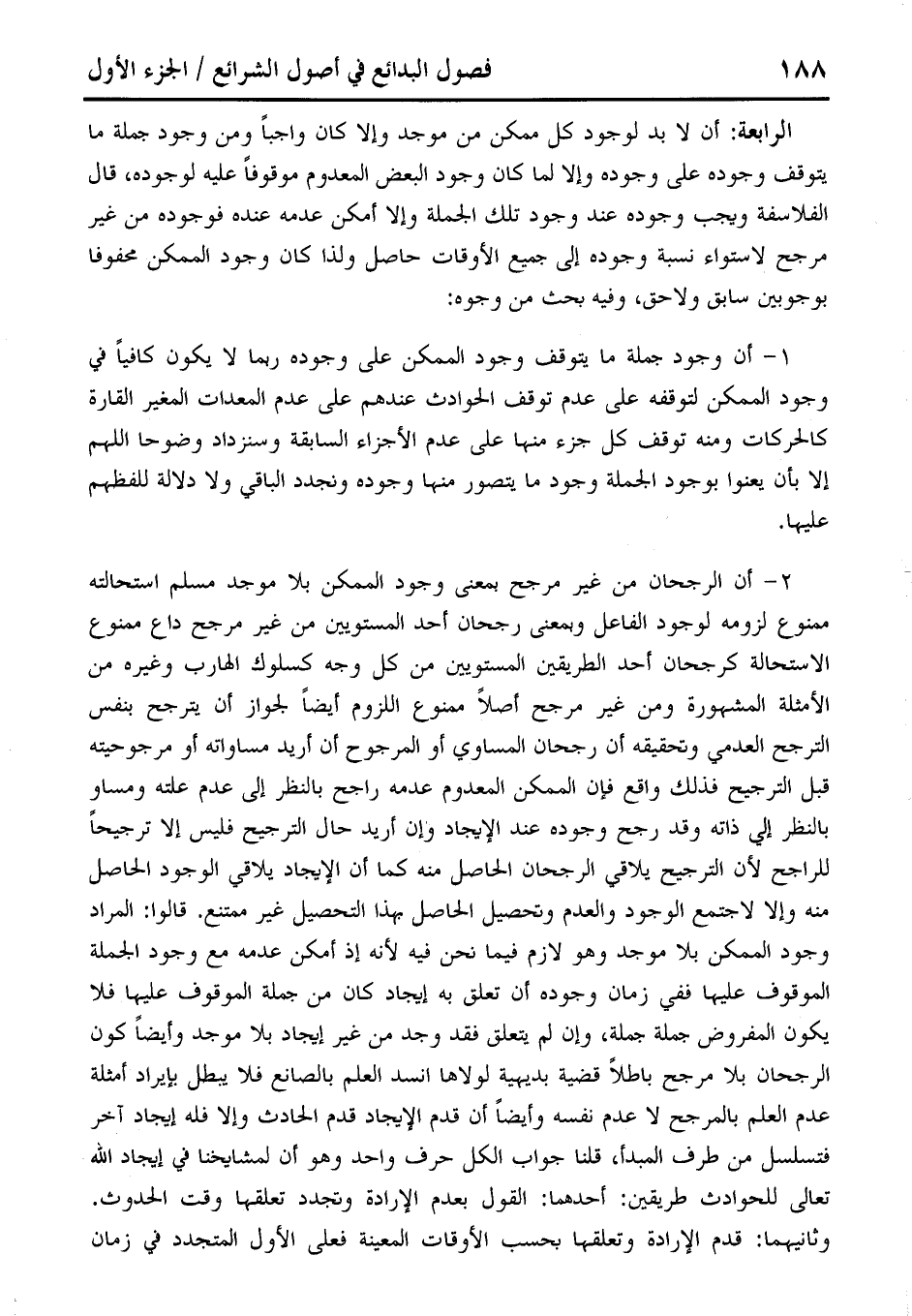الرابعة: أن لا بد لوجود كل ممكن من موجد وإلا كان واجبًا ومن وجود جملة ما يتوقف وجوده على وجوده وإلا لما كان وجود البعض المعدوم موقوفًا عليه لوجوده، قال الفلاسفة ويجب وجوده عند وجود تلك الجملة وإلا أمكن عدمه عنده فوجوده من غير مرجح لاستواء نسبة وجوده إلى جميع الأوقات حاصل ولذا كان وجود الممكن محفوفا بوجوبين سابق ولاحق، وفيه بحث من وجوه: