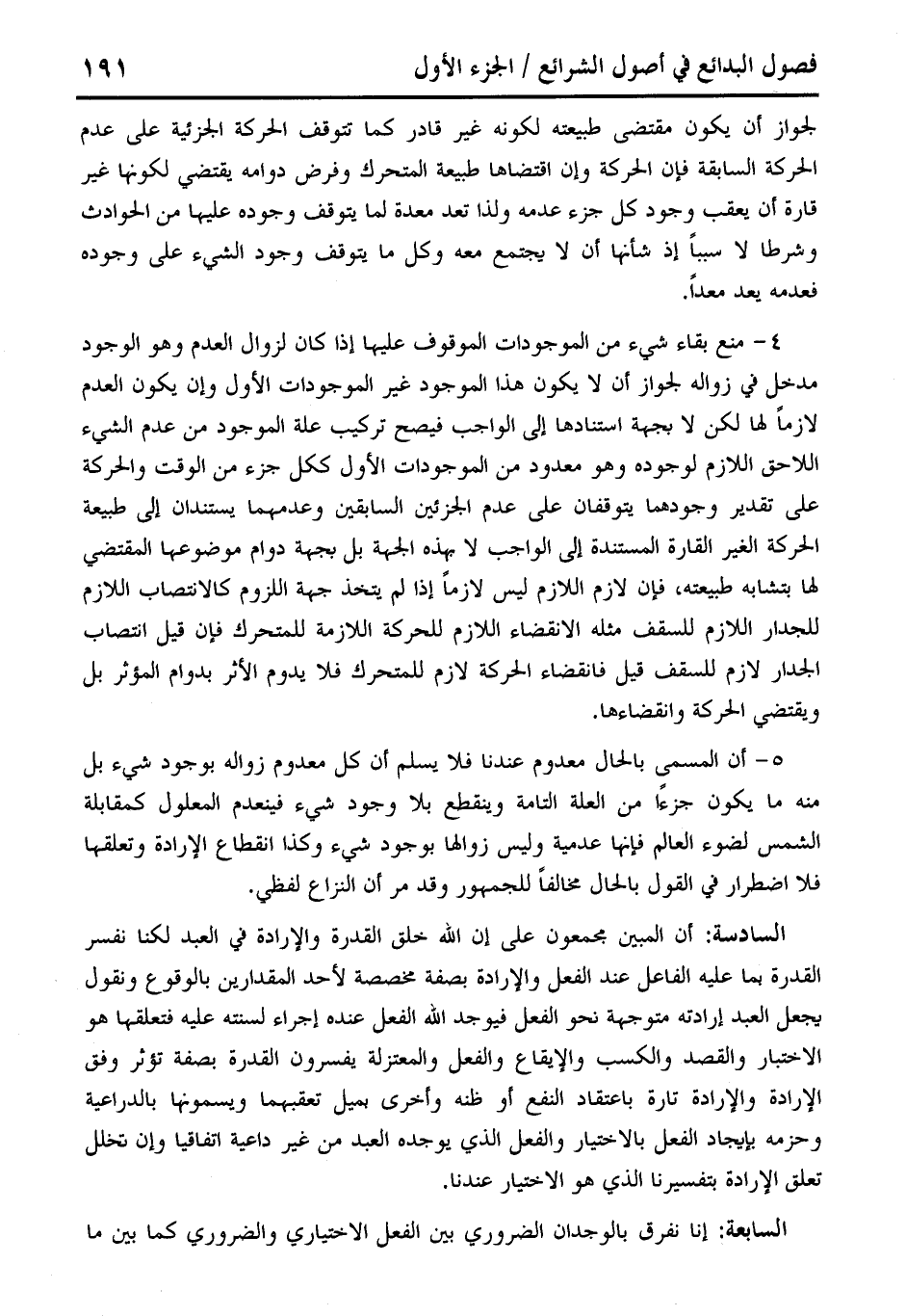 السادسة: أن المبين مجمعون على إن الله خلق القدرة والإرادة في العبد لكنا نفسر القدرة يما عليه الفاعل عند الفعل والإرادة بصفة مخصصة لأحد المقدارين بالوقوع ونقول يجعل العبد إرادته متوجهة نحو الفعل فيوجد الله الفعل عنده إجراء لسنته عليه فتعلقها هو الاختبار والقصد والكسب والإيقاع والفعل والمعتزلة يفسرون القدرة بصفة تؤثر وفق الإرادة والإرادة تارة باعتقاد النفع أو ظنه وأخرى يميل تعقبهما ويسمونها بالدراعية وحزمه بإيجاد الفعل بالاختيار والفعل الذي يوجده العبد من غير داعية اتفافيا وإن تخلل تعلق الإرادة بتفسيرنا الذي هو الاختيار عندنا.
