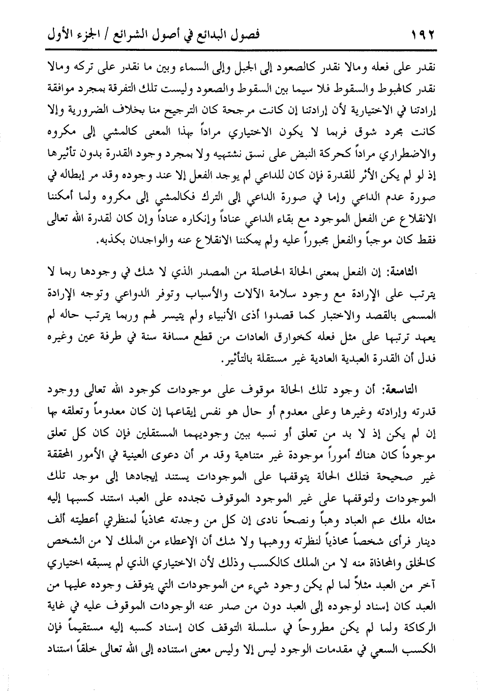 الثامنة: إن الفعل بمعنى الحالة الحاصلة من المصدر الذي لا شك في وجودها ربما لا يترتب على الإرادة مع وجود سلامة الآلات والأسباب وتوفر الدواعي وتوجه الإرادة المسمى بالقصد والاختبار كما قصدوا أذى الأنبياء ولم يتيسر لهم ورما يترتب حاله لم يعهد ترتبها على مثل فعله كخوارق العادات من قطع مسافة سنة في طرفة عين وغيره فدل أن القدرة العبدية العادية غير مستقلة بالتأثير.