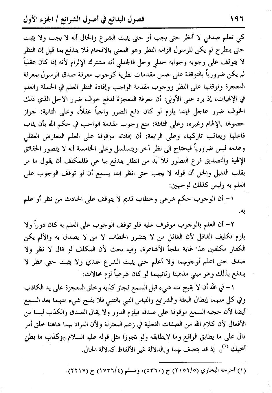 2 - أن العلم بالوجوب موقوف عليه فلو توقف الوجوب على العلم به كان دورًا ولا يلزم تكليف الغافل لأن الغافل من لا يتضرر الخطاب لا من لا يصدق به والألم يكن الكفار مكلفين هذا غاية ملجأ الأشاعرة، وفيه بحث لأن المكلف لو قال لا نظر ولا صدق حتى اعلم لوجوبهما ولا أعلم حتى يثبت الشرع عندي ولا يثبت حتى انظر لا يندفع بذلك وهو مبني مذهبنا وثانيهما لو كان شرعيًا لزم محالات: