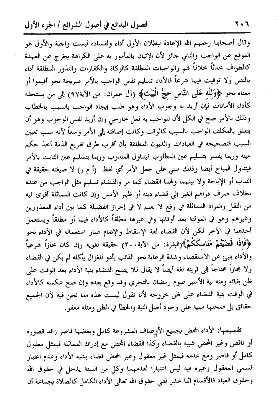 وقال أصحابنا رحمهم الله الإعادة لبطلان الأول أداء ولفساده ليست واجبة والأول هو الموقع عن الواجب والثاني جائز لأن الإتيان بالمأمور به على الكراهة يخرج عن العهدة كالطواف محدثًا خلافًا لهم والواجبات المطلقة كالزكاة والكفارات والنذور المطلقة أداء بالنص ولا توقيت فيها شرعًا فالأداء تسليم نفس الواجب بالأمر صريحة نحو أقيموا أو معناه نحو {وَللهِ عَلَى النَّاسِ حِجُّ الْبَيْتِ} (آل عمران: من الآية 97) إلى من يستحقه كأداء الأمانات فإن أريد به وجوب الأداء وهو طلب إيجاد الواجب بالسبب بالخطاب وذلك بالأمر صح في الكل لأن للواجب به فعل خارجي وإن أريد نفس الوجوب وهو أن يتعلق بالمكلف الواجب بالسبب كالوقت وكانت إضافته إلى الأمر وسعًا لأنه سبب تعيين السبب فتصحيحه في العبادات والديون المطلقة بان أقرب طرق تفريغ الذمة أخذ حكم عينه وربما يفسر بتسليم عين المطلوب فيتناول المندوب وربما بتسليم عين الثابت بالأمر فيتناول المباح أيضًا وذلك مبني على جعل الأمر أي لفظ (أم ر) لا صيغته حقيقة في الندب أو الإباحة ولا بينهما ولهما القضاء كما مر والقضاء تسليم مثل الواجب من عنده بخلاف صرف دراهم الغير إلى قضاء دينه أو ظهر الأمس وإن كانت المماثلة أقوى فيه من النقل والمراد المماثلة في رفع لا نعلم لا في إحراز الفضيلة كما بين أداء المعذورين وغيرهم وهو في الموقتة بعد أوقاتها ولق غيرها مطلقًا كالأداء فيها أو مطلقًا ويستعمل أحدهما في الآخر لكن لأن القضاء لغة الإسقاط والإتمام صار استعماله في الأداء نحو {فَإذَا قَضيْتُمْ مَنَاسِكَكُمْ} (البقرة: من الآية. 200) حقيقة لغوية وإن كان مجازًا شرعيًا والأَداء ينبئ عن الاستقصاء وشدة الرعاية نحو الذئب يأدو للغزال يأكله لم يكن في القضاء ولا مجازًا محتاجًا إلى قرينه لغة أيضًا لا يقال فلا يصح القضاء بنية الأداء بعد الوقت على ظن بقائه ومنه نية الأسير صوم رمضان بالتحري وقد وقع بعده وإن صح عكسه كالأداء في الوقت بنية القضاء على ظن خروجه لأنا نقول ليست هذه مما نحن فيه لأن الجميع حقائق بل صحتها مبنية على وجود أصل النية والخطأ في الظن ومثله معفو.