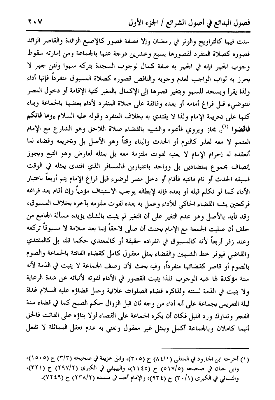 سنت فيها كالتراويح والوتر في رمضان وإلا فصفة قصور كالإصبع الزائدة والقاصر الزائد قصوره كصلاة المنفرد لقصورها بسبع وعشرين درجة عنها بالجماعة ومن إمارته سقوط وجوب الجهر فإنه في الجهر به صفة كمال لوجوب السجدة بتركه سهوا ولئن جهر لا يحرز به ثواب الواجب لعدم وجوبه والناقص قصوره كصلاة المسبوق منفردًا فإنها أداء ولذا يقرأ ويسجد للسهو ويتغير قصرها إلى إلاكمال بالمغير كنية الإقامة أو دخول العصر للتوضيء قبل فراغ أمامه أو بعده وفائقة على صلاة المنفرد لأداء بعضها بالجماعة وبناء كلها على تحريمة الإمام ولذا لا يقتدي به بخلاف المنفرد وقوله عليه السلام "وما فاتكم فاقضوا (¬1) " مجاز ويروي فأتموه والشبيه بالقضاء صلاة اللاحق وهو الشارع مع الإِمام المتمم لا معه لعذر كالنوم أو الحدث والبناء وقتًا وهو الأصل بل وتحريمة وقضاء لما أنعقده له إحرام الإِمام لا يعنيه لفوت ملتزمة معه بل بمثله لعارض وهو التبع ويجوز إنصاف مجموع بمتضادين بل وواحد باعتبارين فالمسافر الذي اقتدى يمثله في الوقت فسبقه الحدث أو نام فانتبه فأقام أو دخل مصر لوضوء قبل فراغ الإمام يتم أربعًا باعتبار الأداء كما لو تكلم قبله أو بعده فإنه لابطاله يوجب الاستيناف موديًا وإن أقام بعد فراغه فركعتين يشبه القضاء الحاكي للأداء وعمل به بعده لفوت ملتزمه بآخره بخلاف المسبوق، وقد تأيد بالأصل وهو عدم التغير على أن التغير لم يثبت بالشك يؤيده مسألة الجامع من حلف أن صليت الجمعة مع الإِمام يحنث أن صلى لاحقًا إنما بعد سلامة لا مسبوقًا تركعه وعند زفر أربعًا لأنه كالمسبوق في انفراده حقيقة أو كالمعتدي حكمًا قلنا بل كالمقتدي والقاضي فيوفر خط الشبهين والقضاء يمثل معقول كامل كقضاء الفائتة بالجماعة والصوم بالصوم أو قاصركقضائها منفردًا، وفيه بحث لأن وصف الجماعة لا يثبت في الذمة لأنه سنة مؤكدة لها شبه الوجوب فلذا يثبت القصور في الأداء لفوته لأنبائه عن شدة الرعاية ولا يثبت في الذمة لسنته ولذاكره قضاء الصلوات علانية وحمل قضاؤه عليه السلام غداة ليلة التعريس بجماعة على أنه أداء من وجه ثان قبل الزوال حكم الصبح كما في قضاء سنة الفجر وتدارك ورد الليل فكان أن يكره الجماعة على القضاء لولا بناؤه على الفائت فالحق أنهما كاملان وبالجماعة أكمل ويمثل غير معقول ونعني به عدم تعقل المماثلة لا تفعل