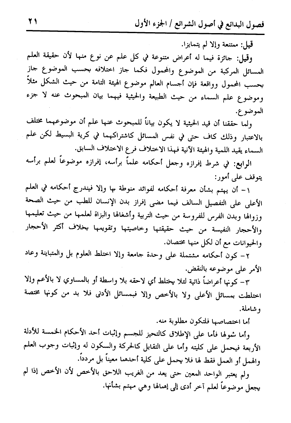 1 - أن يهتم بشأن معرفة أحكامه لفوائد منوطة بها وإلا فيندرج أحكامه في العلم الأعلى على التفصيل السالف فيما مضى إفراز بدن الإنسان للطب من حيث الصحة وزوالها وبدن الفرس للفروسة من حيث التربية وأشغالها والبزاة لعلمها من حيث تعليمها والأحجار النفيسة من حيث حقيقتها وخاصيتها وتقويمها بخلاف أكثر الأحجار والحيوانات مع أن لكل منها مختصان.