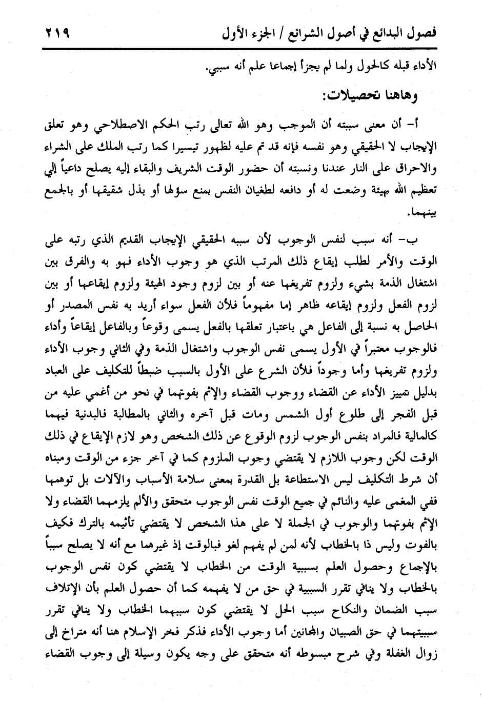 ب - أنه سبب لنفس الوجوب لأن سببه الحقيقي الإيجاب القديم الذي رتبه على الوقت والأمر لطلب إيقاع ذلك المرتب الذي هو وجوب الأداء فهو به والفرق بين اشتغال الذمة بشيء ولزوم تفريغها عنه أو بين لزوم وجود الهيئة ولزوم إيقاعها أو بين لزوم الفعل ولزوم إيقاعه ظاهر إما مفهومًا فلأن الفعل سواء أريد به نفس المصدر أو الحاصل به نسبة إلى الفاعل هي باعتبار تعلقها بالفعل يسمى وقوعًا وبالفاعل إيقاعًا وأداء فالوجوب معتبرًا في الأول يسمى نفس الوجوب واشتغال الذمة وفي الثاني وجوب الأداء ولزوم تفريغها وأما وجودًا فلأن الشرع على الأول بالسبب ضبطًا للتكليف على العباد بدليل تمييز الأداء عن القضاء ووجوب القضاء والإثم بفوتهما في نحو من أغمي عليه من قبل الفجر إلى طلوع أول الشمس ومات قبل آخره والثاني بالمطالبة فالبدنية فيهما كالمالية فالمراد بنفس الوجوب لزوم الوقوع عن ذلك الشخص وهو لازم الايقاع في ذلك الوقت لكن وجوب اللازم لا يقتضي وجوب الملزوم كما في آخر جزء من الوقت ومبناه أن شرط التكليف ليس الاستطاعة بل القدرة بمعنى سلامة الأسباب والألات بل توهمها ففي المغمى عليه والنائم في جميع الوقت نفس الوجوب متحقق والألم يلزمهما القضاء ولا الاثم بفوتهما والوجوب في الجملة لا على هذا الشخص لا يقتضي تأثيمه بالترك فكيف بالفوت وليس ذا بالخطاب لأنه لمن لم يفهم لغو فبالوقت إذ غيرهما مع أنه لا يصلح سببًا بالإجماع وحصول العلم بسببية الوقت من الخطاب لا يقتضي كون نفس الوجوب بالخطاب ولا ينافي تقرر السببية في حق من لا يفهمه كما أن حصول العلم بأن الإتلاف سبب الضمان والنكاح سبب الحل لا يقتضي كون سببهما الخطاب ولا ينافي تقرر سببيتهما في حق الصبيان والمجانين أما وجوب الأداء فذكر فخر الإِسلام هنا أنه متراخ إلى زوال الغفلة وفي شرح مبسوطه أنه متحقق على وجه يكون وسيلة إلى وجوب القضاء