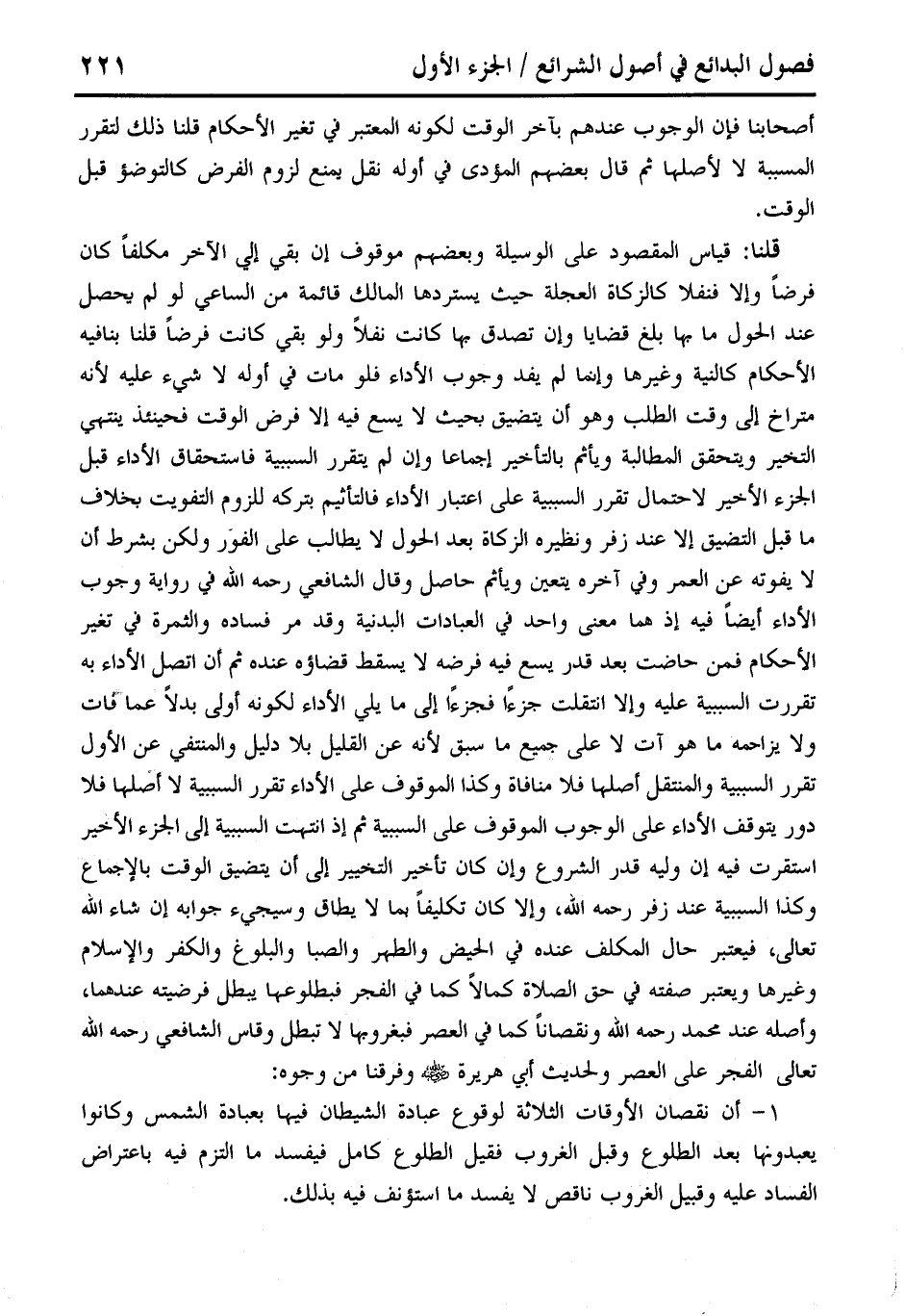 قلنا: قياس المقصود على الوسيلة وبعضهم موقوف إن بقي إلى الآخر مكلفًا كان فرضًا وإلا فنفلا كالزكاة العجلة حيث يستردها المالك قائمة من الساعي لو لم يحصل عند الحول ما بها بلغ قضايا وإن تصدق بها كانت نفلًا ولو بقي كانت فرضًا قلنا بنافيه الأحكام كالنية وغيرها وإنما لم يفد وجوب الأداء فلو مات في أوله لا شىء عليه لأنه متراخ إلى وقت الطلب وهو أن يتضيق بحيث لا يسع فيه إلا فرض الوقت فحينئذ ينتهي التخير ويتحقق المطالبة ويأثم بالتأخير إجماعًا وإن لم يتقرر السببية فاستحقاق الأداء قبل الجزء الأخير لاحتمال تقرر السببية على اعتبار الأداء فالتأثيم بتركه للزوم التفويت بخلاف ما قبل التضيق إلا عند زفر ونظيره الزكاة بعد الحول لا يطالب على الفور ولكن بشرط أن لا يفوته عن العمر وفي آخره يتعين ويأثم حاصل وقال الشافعي رحمه الله في رواية وجوب الأداء أيضًا فيه إذ هما معنى واحد في العبادات البدنية وقد مر فساده والثمرة في تغير الأحكام فمن حاضت بعد قدر يسع فيه فرضه لا يسقط قضاؤه عنده ثم أن اتصل الأداء به تقررت السببية عليه وإلا انتقلت جزعًا فجزعًا إلى ما يلي الأداء لكونه أولى بدلًا عما فات ولا يزاحمه ما هو آت لا على جميع ما سبق لأنه عن القليل بلا دليل والمنتفى عن الأول تقرر السببية والمنتقل أصلها فلا منافاة وهذا الموقوف على الأداء تقرر السببية لا أصلها فلا دور يتوقف الأداء على الوجوب الموقوف على السببية ثم إذ انتهت السببية إلى الجزء الأخير استقرت فيه إن وليه قدر الشروع وإن كان تأخير التخيير إلى أن يتضيق الوقت بالإجماع وهذا السببية عند زفر رحمه الله، وإلا كان تكليفًا بما لا يطاق وسيجيء جوابه إن شاء الله تعالى، فيعتبر حال المكلف عنده في الحيض والطهر والصبا والبلوغ والكفر والإِسلام وغيرها ويعتبر صفته في حق الصلاة كمالًا كما في الفجر فبطلوعها يبطل فرضيته عندهما، وأصله عند محمَّد رحمه الله ونقصانًا كما في العصر فبغروبها لا تبطل وقاس الشافعي رحمه الله تعالى الفجر على العصر ولحديث أبي هريرة - رضي الله عنه - وفرقنا من وجوه:
