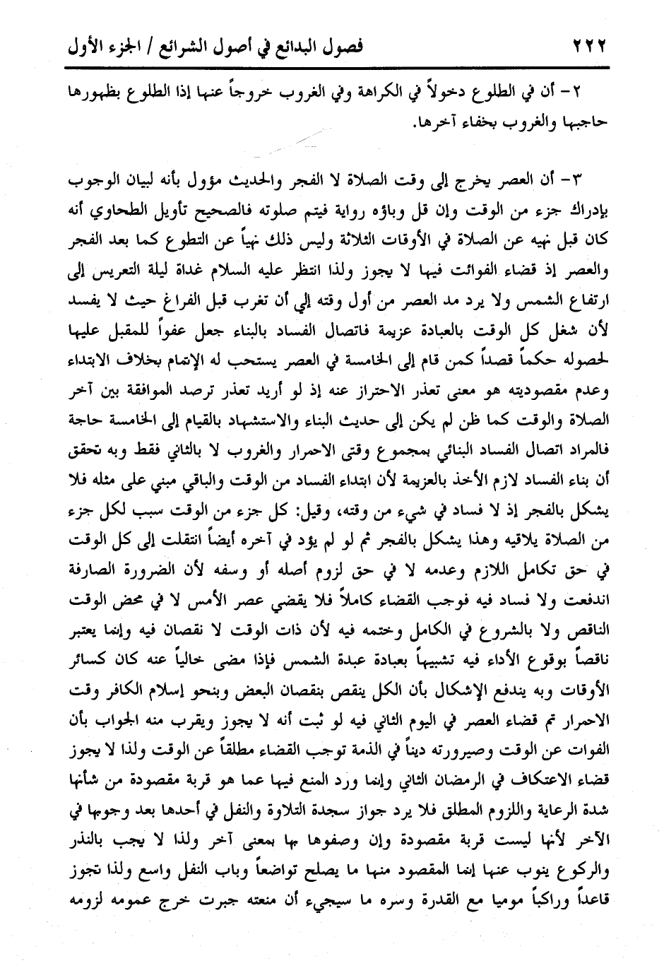 3 - إن العصر يخرج إلى وقت الصلاة لا الفجر والحديث مؤول بأنه لبيان الوجوب بإدراك جزء من الوقت وإن قل وباؤه رواية فيتم صلوته فالصحيح تأويل الطحاوي أنه كان قبل نهيه عن الصلاة في الأوقات الثلاثة وليس ذلك نهيًا عن التطوع كما بعد الفجر والعصر إذ قضاء الفوائت فيها لا يجوز ولذا انتظر عليه السلام غداة ليلة التعريس إلى ارتفاع الشمس ولا يرد مد العصر من أول وقته إلى أن تغرب قبل الفراغ حيث لا يفسد لأن شغل كل الوقت بالعبادة عزيمة فاتصال الفساد بالبناء جعل عفوًا للمقبل عليها لحصوله حكمًا قصدًا كمن قام إلى الخامسة في العصر يستحب له الالقام بخلاف الابتداء وعدم مقصوديته هو معنى تعذر الاحتراز عنه إذ لو أريد تعذر ترصد الموافقة بين آخر الصلاة والوقت كما ظن لم يكن إلى حديث البناء والاستشهاد بالقيام إلى الخامسة حاجة فالمراد اتصال الفساد البنائي بمجموع وقتى الاحمرار والغروب لا بالثاني فقط وبه تحقق أن بناء الفساد لازم الأخذ بالعزيمة لأن ابتداء الفساد من الوقت والباقط مبني على مثله فلا يشكل بالفجر إذ لا فساد في شيء من وقته، وقيل: كل جزء من الوقت سبب لكل جزء من الصلاة يلاقيه وهذا يشكل بالفجر ثم لو لم يؤد في آخره أيضًا انتقلت إلى كل الوقت في حق تكامل اللازم وعدمه لا في حق لزوم أصله أو وسفه لأن الضرورة الصارفة اندفعت ولا فساد فيه فوجب القضاء كاملًا فلا يقضي عصر الأمس لا في محض الوقت الناقص ولا بالشروع في الكامل وختمه فيه لأن ذات الوقت لا نقصان فيه وإنما يعتبر ناقصًا بوقوع الأداء فيه تشبيهًا بعبادة عبدة الشمس فإذا مضى خاليًا عنه كان كسائر الأوقات وبه يندفع الإشكال بأن الكل ينقص بنقصان البعض وبنحو إسلام الكافر وقت الإحمرار تم قضاء العصر في اليوم الثاني فيه لو ثبت أنه لا يجوز ويقرب منه الجواب بأن الفوات عن الوقت وصيرورته دينًا في الذمة توجب القضاء مطلقًا عن الوقت ولذا لا يجوز قضاء الاعتكاف في الرمضان الثاني وإنما ورد المنع فيها عما هو قربة مقصودة من شأنها شدة الرعاية واللزوم المطلق فلا يرد جواز سجدة التلاوة والنفل في أحدها بعد وجوبها في الآخر لأنها ليست قربة مقصودة وإن وصفوها بها بمعنى آخر ولذا لا يجب بالنذر والركوع ينوب عنها إنما المقصود منها ما يصلح تواضعًا وباب النفل واسع ولذا تجوز قاعدًا وراكبًا موميا مع القدرة وسره ما سيجيء أن منعته جبرت خرج عمومه لزومه