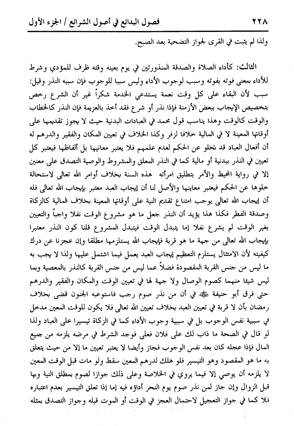 الثالث: كأداء الصلاة والصدقة المنذورتين في يوم بعينه وقته ظرف للمؤدي وشرط للأداء بمعنى فوته بفوته وسبب لوجوب الأداء وليس سببا للوجوب فإن سببه النذر وقيل: سبب لأن البقاء على كل وقت نعمة يستدعي الخدمة شكرًا غير أن الشرع رخص بتخصيص الإيجاب ببعض الأزمنة فإذا نذر أو شرع فقد أخذ بالعزيمة فإن النذر كالخطاب والوقت كالوقت وهذا يناسب قول محمَّد في العبادات البدنية حيث لا يجوز تقديمها على أوقاتها المعينة لا في المالية خلافا لزفر وكذا الخلاف في تعيين المكان والفقير والدرهم له أن أفعال العباد قد تخلو عن الحكم لعدم علمهم فلا يعتبر معانيها بل ألفاظها فيعتبر كل تعيين في النذر ببدنية أو مالية كما في النذر المعلق والمشروط والوصية التصدق على معنين إلا في رواية المحيط والأمر بتطليق امرأته هذه السنة بخلاف أوامر الله تعالى لاستحالة خلوها عن الحكم فيعتبر معاينها والأصل لنا أن إيجاب العبد معتبر بإيجاب الله تعالى فله أن إيجاب الله تعالى يوجب امتناع تقديم النية على أوقاتها المعينة بخلاف المالية كالزكاة وصدقة الفطر فكذا هذا يؤيد أن النذر جعل ما هو مشروع الوقت نفلا واجبًا والتعين بغير الوقت لم يشرع نفلًا إما يتبدل الوقت فيتبدل المشروع قلنا كون النذر معتبرا بإيجاب الله تعالى من جهة ما هو قربة فإيجاب الله يستلزمها مطلقا وإن عجزنا عن درك كيفيته لأن الامتثال يستلزم التعطم إيجاب العبد يعمل فيما اشتمل عليها ولذا لا يجب به ما ليس من جنس القربة المقصودة فضلًا عما ليس من جنس القربة كالنذر بالمعصية وبما ليس شيئًا منهما كصوم الوصال ولا جهة لها في تعيين الوقت والمكان والفقير والدرهم حتى فرق أبو حنيفة - رضي الله عنه - في أن من نذر صوم رجب فاستوعبه الجنون قضى بخلاف ومضان بأن لا قربة في تعيين العبد بخلاف تعيين الله تعالى فلا يكون للوقت المعين مدخل في سببية نفس الوجوب بل في سببية وجوب الأداء كما في الزكاة تيسيرا على العباد ولذا لو قال في الصحة ما ذاب لك على فلان فعلى فوجد الشرط في مرضه يلزمه من جميع المال فإذا عجله كان بعد نفس الوجوب فجاز وأيضًا لا يعتبر تعيين ما إلا من حيث يتعلق به ما هو المقصود وهو التيسير فلو هلك لدرهم المعين سقط ولو مات قبل الوقت المعين لا يلزمه أن يوصى إلا فيما يروي في الخلاصة وعلى ذلك جوازًا لصوم بمطلق النية وبها قبل الزوال وإن جاز لمن نذر صوم يوم النحر أداؤه فيه إما إذا تعلق التيسير بعدم اعتباره فلا كما في جواز التعجيل لاحتمال العجز في الوقت أو الموت قبله وجواز التصدق بمثله