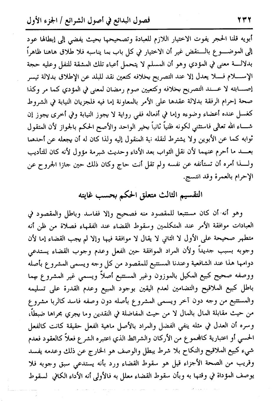 وهو أنه أن كان مستتبعا للمقصود منه فصحيح وإلا ففاسد وباطل والمقصود في العبادات موافقة الأمر عند المتكلمين وسقوط القضاء عند الفقهاء فصلاة من ظن أنه متطهر صحيحة على الأول لا الثاني لا يقال لا موافقة فيها وإلا لم يجب القضاء إما لأن وجوبه بسبب جديدًا ولأن المراد الموافقة حين الفعل وعدم وجوب القضاء يستدعي دوامها هذا عند الشافعية وعندنا المستتبع للمقصود من كل وجه ويسمى المشروع بأصله ووصفه صحيح كبيع المكيل بالموزون وغير المستتبع أصلًا ويسمى غير المشروع بهما باطل كبيع الملاقيح والتضامين لعدم اليقين بوجود المبيع وعدم القدرة على تسليمه والمستتبع من وجه دون آخر ويسمى المشروع بأصله دون وصفه فاسد كالربا مشروع من حيث مقابلة المال بالمال لا من حيث المفاضلة في النقدين وما يجري مجراها ضبطًا، وسره أن العدل في مثله ينفى الفضل والمراد بالأصل ماهية الفعل حقيقة كانت كالفعل الحسن أو اعتبارية كالمجموع من الأركان والشرائط الذي اعتبره الشرع فعلًا كالعقود فعدم شيء كبيع الملاقيح والنكاح بلا شرط يبطل والوصف هو الخارج عن ذلك وعدمه يفسد وقريب من الصحة الأجزاء قيل هو سقوط القضاء ورد بأنه يستدعي سبق وجوبه فلا يوصف الموداة في وقتها به وبأن سقوط القضاء معلل به فالأولى أنه الأداء الكافي لسقوط