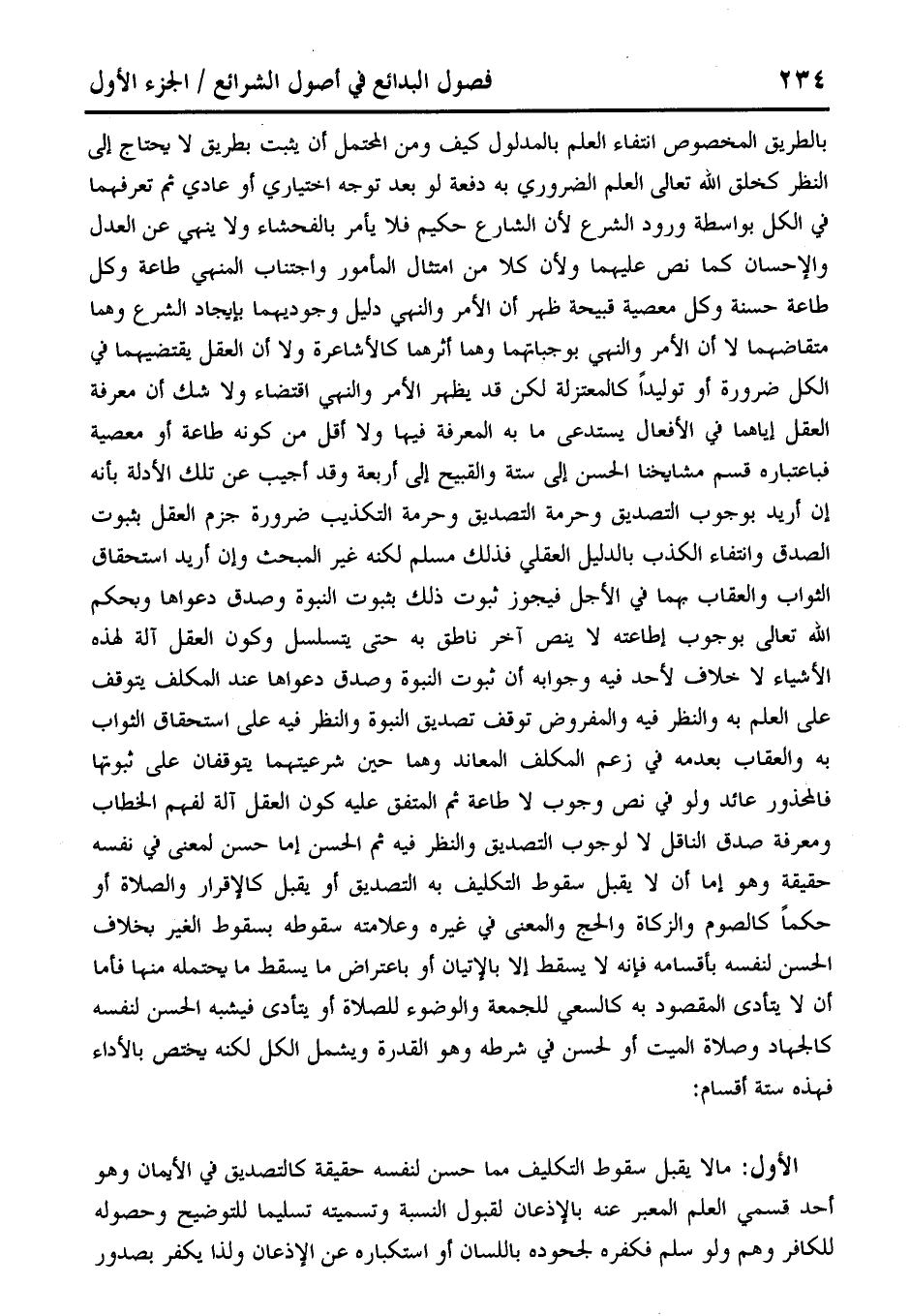 بالطريق المخصوص انتفاء العلم بالمدلول كيف ومن المحتمل أن يثبت بطريق لا يحتاج إلى النظر كخلق الله تعالى العلم الضروري به دفعة لو بعد توجه اختياري أو عادي ثم تعرفهما في الكل بواسطة ورود الشرع لأن الشارع حكيم فلا يأمر بالفحشاء ولا ينهى عن العدل والإحسان كما نص عليهما ولأن كلا من امتثال المأمور واجتناب المنهي طاعة وكل طاعة حسنة وكل معصية قبيحة ظهر أن الأمر والنهى دليل وجوديهما بإيجاد الشرع وهما متقاضهما لا أن الأمر والنهى بوجباتهما وهما أثرهما كالأشاعرة ولا أن العقل يقتضيهما في الكل ضرورة أو توليدًا كالمعتزلة لكن قد يظهر الأمر والنهى اقتضاء ولا شك أن معرفة العقل إياهما في الأفعال يستدعى ما به المعرفة فيها ولا أقل من كونه طاعة أو معصية فباعتباره قسم مشايخنا الحسن إلى ستة والقبيح إلى أربعة وقد أجيب عن تلك الأدله بأنه إن أريد بوجوب التصديق وحرمة التصديق وحرمة التكذيب ضرورة جزم العقل بثبوت الصدق وانتفاء الكذب بالدليل العقلي فذلك مسلم لكنه غير المبحث وإن أريد استحقاق الثواب والعقاب بهما في الأجل فيجوز ثبوت ذلك بثبوت النبوة وصدق دعواها وبحكم الله تعالى بوجوب إطاعته لا ينص آخر ناطق به حتى يتسلسل وكون العقل آلة لهذه الأشياء لا خلاف لأحد فيه وجوابه أن ثبوت النبوة وصدق دعواها عند المكلف يتوقف على العلم به والنظر فيه والمفروض توقف تصديق النبوة والنظر فيه على استحقاق الثواب به والعقاب بعدمه في زعم المكلف المعاند وهما حين شرعيتهما يتوقفان على ثبوتها فالمحذور عائد ولو في نص وجوب لا طاعة ثم المتفق عليه كون العقل آلة لفهم الخطاب ومعرفة صدق الناقل لا لوجوب التصديق والنظر فيه ثم الحسن إما حسن لمعنى في نفسه حقيقة وهو إما أن لا يقبل سقوط التكليف به التصديق أو يقبل كالاقرار والصلاة أو حكمًا كالصوم والزكاة والحج والمعنى في غيره وعلامته سقوطه بسقوط الغير بخلاف الحسن لنفسه بأقسامه فإنه لا يسقط إلا بالإتيان أو باعتراض ما يسقط ما يحتمله منها فأما أن لا يتأدى المقصود به كالسعي للجمعة والوضوء للصلاة أو يتأدى فيشبه الحسن لنفسه كالجهاد وصلاة الميت أو لحسن في شرطه وهو القدرة ويشمل الكل لكنه يختص بالأداء فهذه ستة أقسام: