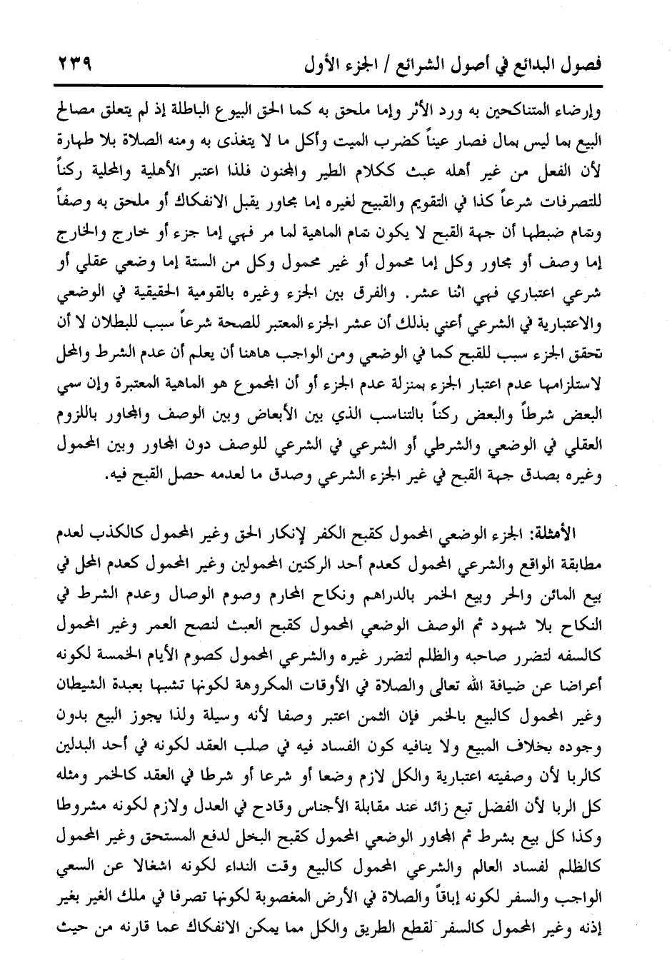 الأمثلة: الجزء الوضعي المحمول كقبح الكفر لإنكار الحق وغير المحمول كالكذب لعدم مطابقة الواقع والشرعي المحمول كعدم أحد الركنين المحمولين وغير المحمول كعدم المحل في ْبيع المائن والحر وبيع الخمر بالدراهم ونكاح المحارم وصوم الوصال وعدم الشرط في النكاح بلا شهود ثم الوصف الوضعي المحمول كقبح العبث لنصح العمر وغير المحمول كالسفه لتضرر صاحبه والظلم لتضرر غيره والشرعي المحمول كصوم الأيام الخمسة لكونه أعراضا عن ضيافة الله تعالى والصلاة في الأوقات المكروهة لكونها تشبها بعبدة الشيطان وغير المحمول كالبيع بالخمر فإن الثمن اعتبر وصفا لأنه وسيلة ولذا يجوز البيع بدون وجوده بخلاف المبيع ولا ينافيه كون الفساد فيه في صلب العقد لكونه في أحد البدلين كالربا لأن وصفيته اعتبارية والكل لازم وضعًا أو شرعًا أو شرطًا في العقد كالخمر ومثله كل الربا لأن الفضل تبع زائد عند مقابلة الأجناس وقادح في العدل ولازم لكونه مشروطا وكذا كل بيع بشرط ثم المجاور الوضعى المحمول كقبح البخل لدفع المستحق وغير المحمول كالظلم لفساد العالم والشرعي المحمول كالبيع وقت النداء لكونه اشغالا عن السعي الواجب والسفر لكونه إباقًا والصلاة في الأرض المغصوبة لكونها تصرفا في ملك الغير بغير إذنه وغير المحمول كالسفر لقطع الطريق والكل مما يمكن الإنفكاك عما قارنه من حيث
