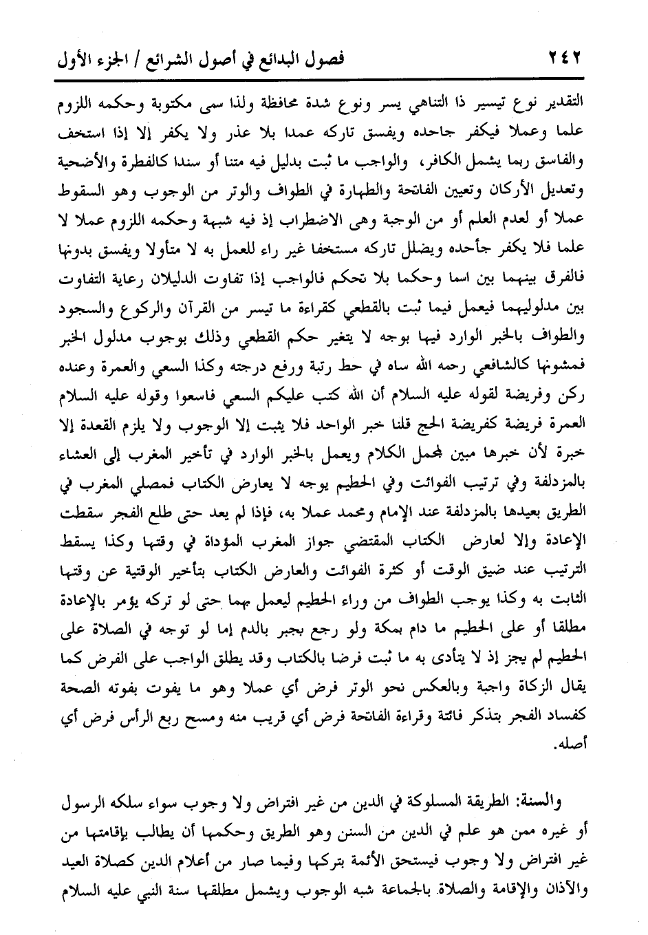 التقدير نوع تيسير ذا التناهي يسر ونوع شدة محافظة ولذا سمى مكتوبة وحكمه اللزوم علمًا وعملًا فيكفر جاحده ويفسق تاركه عمدا بلا عذر ولا يكفر إلا إذا استخف والفاسق ربما يشمل الكافر، والواجب ما ثبت بدليل فيه متنا أو سندا كالفطرة والأضحية وتعديل الأركان وتعين الفاتحة والطهارة في الطواف والوتر من الوجوب وهو السقوط عملا أو لعدم العلم أو من الوجبة وهي الاضطراب إذ فيه شبهة وحكمه اللزوم عملا لا علمًا فلا يكفر جاحده ويضلل تاركه مستخفا غير راء للعمل به لا متأولا ويفسق بدونها فالفرق بينهما بين اسما وحكما بلا تحكم فالواجب إذا تفاوت الدليلان رعاية التفاوت بين مدلوليهما فيعمل فيما ثبت بالقطعى كقراءة ما تيسر من القرآن والركوع والسجود والطواف بالخبر الوارد فيها بوجه لا يتغير حكم القطعي وذلك بوجوب مدلول الخبر فمشونها كالشافعي رحمه الله ساه في حط رتبة ورفع درجته وهذا السعى والعمرة وعنده ركن وفريضة لقوله عليه السلام أن الله كتب عليكم السعى فاسعوا وقوله عليه السلام العمرة فريضة كفريضة الحج قلنا خبر الواحد فلا يثبت إلا الوجوب ولا يلزم القعدة إلا خبرة لأن خبرها مبين لمجمل الكلام ويعمل بالخبر الوارد في تأخير المغرب إلى العشاء بالمزدلفة وفي ترتيب الفوائت وفي الحطيم يوجه لا يعارض الكتاب فمصلي المغرب في الطريق بعيدها بالمزدلفة عند الإِمام ومحمد عملا به، فإذا لم يعد حتى طلع الفجر سقطت الإعادة وإلا لعارض الكتاب المقتضي جواز المغرب الموداة في وقتها وهذا يسقط الترتيب عند ضيق الوقت أو كثرة الفوائت والعارض الكتاب بتأخير الوقتية عن وقتها الثابت به وهذا يوجب الطواف من وراء الحطيم ليعمل بهما حتى لو تركه يؤمر بالإعادة مطلقا أو على الحطيم ما دام بمكة ولو رجع بجبر بالدم إما لو توجه في الصلاة على الحطيم لم يجز إذ لا يتأدى به ما ثبت فرضا بالكتاب وقد يطلق الواجب على الفرض كما يقال الزكاة واجبة وبالعكس نحو الوتر فرض أي عملا وهو ما يفوت بفوته الصحة كفساد الفجر بتذكر فائتة وقراءة الفاتحة فرض أي قريب منه ومسح ربع الرأس فرض أي أصله.