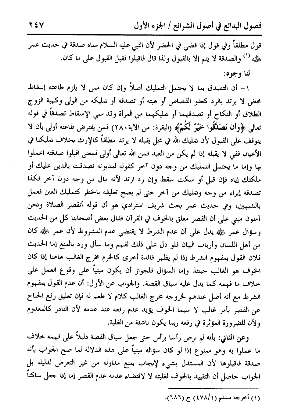 1 - أن التصدق بما لا يحتمل التمليك أصلًا وإن كان ممن لا يلزم طاعته إسقاط محض لا يرتد بالرد كعفو القصاص أو هبته أو تصدقه أو تمليكه من الولى وكهبة الزوج الطلاق أو النكاح أو تصدقهما أو تمليكهما من المرأة وقد سمي الإسقاط تصدقًا في قوله تعالى {وَأَنْ تَصَدَّقُوا خَيْرٌ لَكُمْ} (البقرة: من الآية 280) فمن يفترض طاعته أولى بأن لا يتوقف على القبول لأن تمليك الله في محل يقبله لا يرتد مطلقًا كالإرث بخلاف تمليكنا في الأعيان ففى لا يقبله إذا لم يكن من العبد فمن الله تعالى أولى فمعنى اقبلوا صدقته اعملوا بها وإما ما يحتمل التمليك من وجه دون آخر كقوله لمديونه تصدقت بالدين عليك أو ملكتك إياه فإن قبل أو سكت سقط وإن رد ارتد لأنه مال من وجه دون آخر فكذا تصدقه ابراء من وجه وتمليك من آخر حتى لم يصح تعليقه بالخطر كتمليك العين فعمل بالشبهين، وفي حديث عمر بحث شريف استرادي هو أن قوله أنقصر الصلاة ونحن آمنون مبني على أن القصر معلق بالخوف في القرآن فقال بعض أصحابنا كل من الحديث وسؤال عمر - رضي الله عنه - يدل على أن عدم الشرط لا يقتض عدم المشروط لأن عمر - رضي الله عنه - كان من أهل اللسان وأرباب البيان فلو دل على ذلك لفهم وما سأل ورد بالمنع إما الحديث فلان القول بمفهوم الشرط إذا لم يظهر فائدة أخرى كالخرم مخرج الغالب ها هنا إذا كان الخوف هو الغالب حينئذ وإما السوال فلجواز أن يكون مبنيًا على وقوع العمل على خلاف ما فهمه كما يدل عليه سياق القصة. والجواب عن الأول: أن عدم القول بمفهوم الشرط مع أنه أصل عندهم لخروجه مخرج الغالب كلام لا طعم له فإن تعليق رفع الجناح عن القصر بأمر غالب لا سيما الخوف يويد عدم رفعه عند عدمه لأن النادر كالمعدوم ولأن للضرورة المؤثرة في رفعه ربما يكون ناشئة من الغلبة.