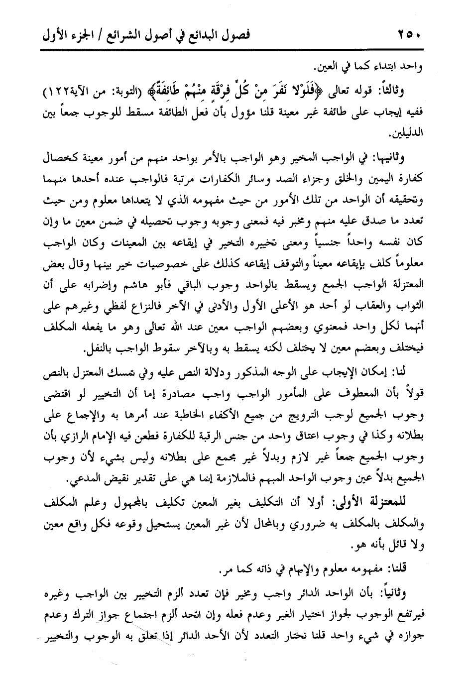وثاكً: قوله تعالى {فَلَوْلَا نَفَرَ مِنْ كُلِّ فِرْقَةٍ مِنْهُمْ طَائِفَةٌ} (التوبة: من الآية 122) ففيه إيجاب على طائفة غير معينة قلنا مؤول بأن فعَل الطائفة مسقط للوجوب جمعًا بين الدليلين.