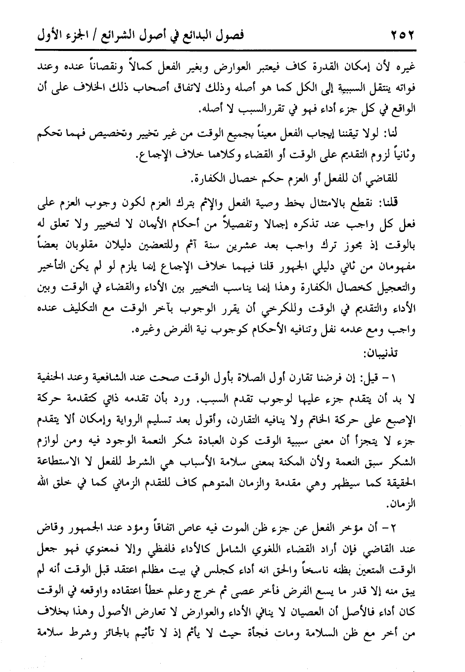 1 - قيل: إن فرضنا تقارن أول الصلاة بأول الوقت صحت عند الشافعية وعند الحنفية لا بد أن يتقدم جزء عليها لوجوب تقدم السبب. ورد بأن تقدمه ذاتي كتقدمة حركة الإصبع على حركة الخاتم ولا ينافيه التقارن، وأقول بعد تسليم الرواية وإمكان ألا يتقدم جزء لا يتجزأ أن معنى سببية الوقت كون العبادة شكر النعمة الوجود فيه ومن لوازم الشكر سبق النعمة ولأن المكنة بمعنى سلامة الأسباب هى الشرط للفعل لا الاستطاعة الحقيقة كما سيظهر وهي مقدمة والزمان المتوهم كاف للتقدم الزماني كما في خلق الله الزمان.