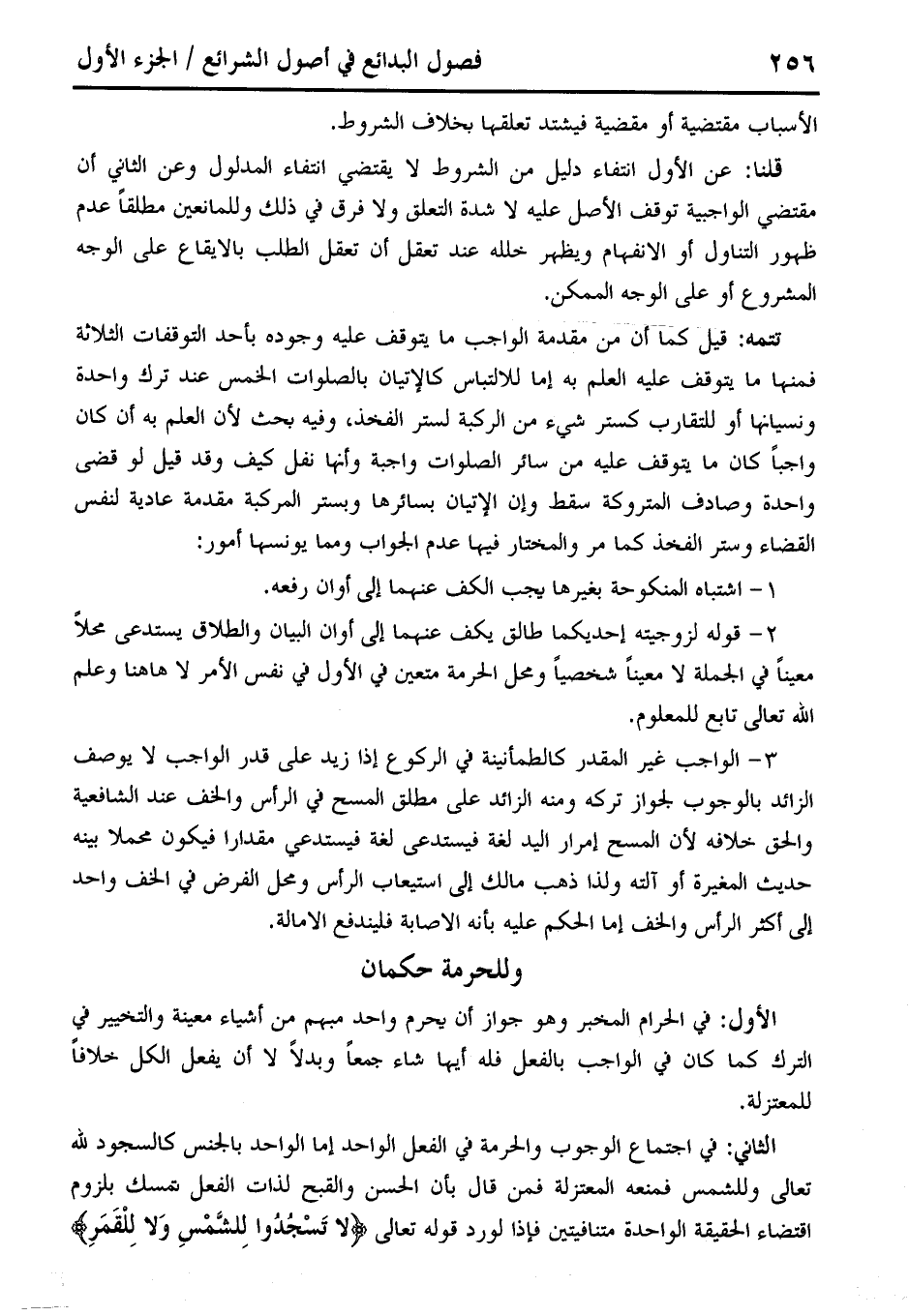 الثاني: في اجتماع الوجوب والحرمة في الفعل الواحد إما الواحد بالجنس كالسجود لله تعالى وللشمس فمنعه المعتزلة فمن قال بأن الحسن والقبح لذات الفعل تمسك بلزوم اقتضاء الحقيقة الواحدة متنافيتين فإذا لورد قوله تعالى {لَا تَسْجُدُوا لِلشَّمْسِ وَلَا لِلْقَمَرِ}