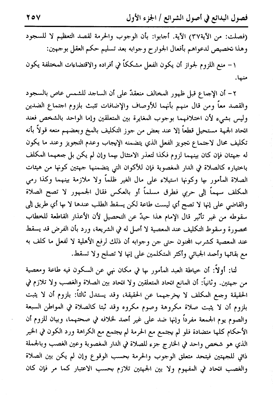 2 - أن الإجماع قبل ظهور المخالف منعقدٌ على أن الساجد للشمس عاص بالسجود والقصد معًا ومن قال منهم بأنهما للأوصاف والإضافات تثبث بلزوم اجتماع الضدين وليس بشيء لأن اختلافهما بوجوب المغايرة بين المتعلقين وإما الواحد بالشخص فعند اتحاد الجهة مستحيل قطعًا إلا عند بعض من جوز التكليف بالمخ وبعضهم منعه قولًا بأنه تكليف محال لاجتماع تجويز الفعل الذي يتضمنه الإيجاب وعدم التجويز وعند ما يكون له جهتان فإن كان بينهما لزوم فكذا لتعذر الامتثال بهما وإن لم يكن بل جمعهما المكلف باختياره كالصلاة في الدار المغصوبة فإن للأكوان التي يتضمنها جهتين كونها من هيئات الصلاة المأمور بها وكونها استيلاء على مال الغير ظلمًا ولا ملازمة بينهما وكذا رمي المكلف سهمًا إلى حربي فطرق مسلمًا أو بالعكس فقال الجمهور لا تصح الصلاة والقاضي على إنها لا تصح أي ليست طاعة لكن يسقط الطلب عندها لا بها أي طريق إلى سقوطه من غير تأثير قال الإِمام هذا حيدٌ عن التحصيل لأن الأعذار القاطعة للخطاب محصورة وسقوط التكليف عند المعصية لا أصل له في الشريعة، ورد بأن الفرض قد يسقط عند المعصية كشرب المجنون حتى جن وجوابه أن ذلك لرفع الأهلية لا لفعل ما كلف به مع بقائها وأحمد الجبائي وأكثر المتكلمين على إنها لا تصلح ولا تسقط.