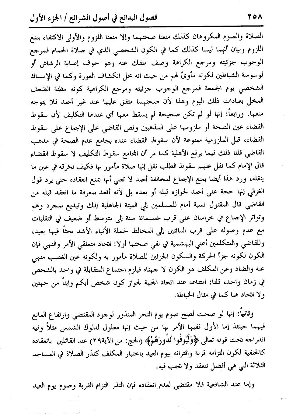 الصلاة والصوم المكروهان كذلك منعنا صحتهما وإلا منعنا اللزوم والأولى الاكتفاء يمنع اللزوم وبيان أنهما ليسا كذلك كما في الكون الشخصي الذي في صلاة الحمام فمرجع الوجوب جزئيته ومرجع الكراهة وصف منفك عنه وهو خوف إصابة الرشاش أو لوسوسة الشياطين لكونه مأوىً لهم من حيث أنه محل انكشاف العورة وكما في الإمساك الشخصي يوم الجمعة فمرجع الوجوب جزئيته ومرجع الكراهية كونه مظنة الضعف المخل بعبادات ذلك اليوم وهذا لأن صحتهما متفق عليها عند غير أحمد فلا يتوجه منعها. ورابعًا: إنها لو لم تكن صحيحة لم يسقط معها أي عندها التكليف لأن سقوط القضاء عين الصحة أو ملزومها على المذهبين ونص القاضي على الإجماع على سقوط القضاء قبل الملزومية ممنوعة لأن سقوط القضاء عنده بجامع عدم الصحة في مذهب القاضي قلنا ذلك فيما يرفع الأهلية كما مر أن المجامع سقوط التكليف لا سقوط القضاء قال الإِمام كما نفل عنهم سقوط الطلب نقل إنها صلاة مأمور بها فكيف نخرقه في عين ما ينقله، ورد هذا أيضا بمنع الإجماع لمخالفة أحمد لا تعني أنها لقنع انعقاده حتى يرد قول الغزالي إنها حجة على أحمد لجوازه قبله أو بعده بل لأنه أقعد بمعرفة ما انعقد قبله من القاضي قال المقتول نسبة أمام للمسلمين التي الميتة الجاهلية إفك وتبديع كمجرد وهم وتواتر الإجماع في خراسان على قرب خمسمائة سنة إلى متوسط أو ضعيف في التقلبات مع عدم وصوله على قرب المائتين إلى المخالط لحملة الأنباء الأشد بحثًا فيها بعيد، وللقاضي والمتكلمين أعني البهشمية في نفى صحتها أولًا: اتحاد متعلقى الأمر والنهي فإن الكون لكونه جزأ الحركة والسكون الجزئين للصلاة مأمور به ولكونه عين الغصب منتهي عنه والضاد وعن المكلف هو الكون لا جهتاه فيلزم اجتماع المتقابلة في واحد بالشخص في زمان واحد، قلنا: امتناعه عند اتحاد الجهة لجواز كون شخص أبكم وابنًا من جهتين ولا اتحاد هنا كما في مثال الخياطة.