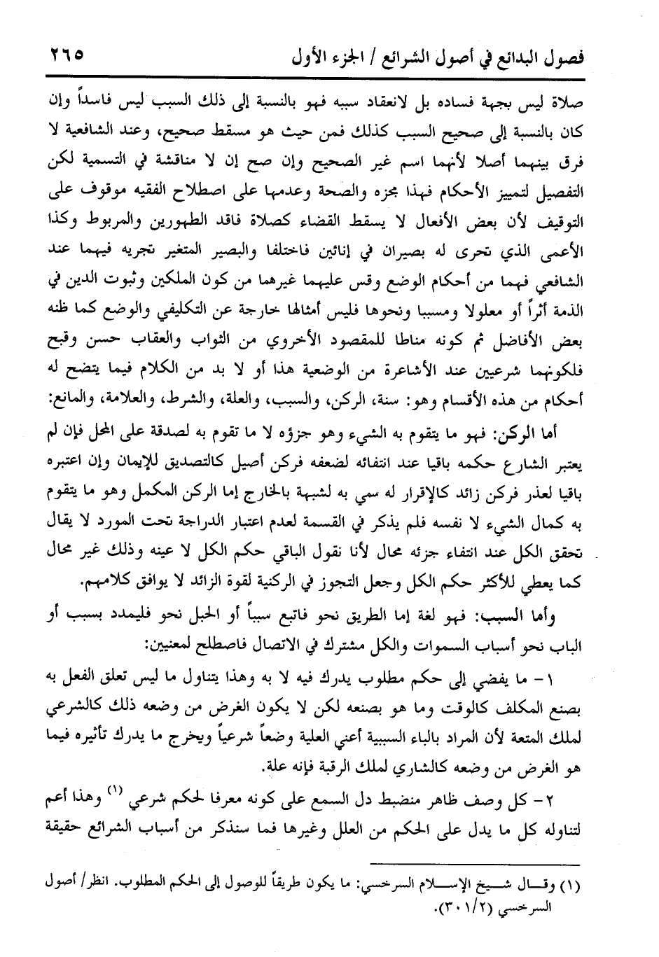صلاة ليس بجهة فساده بل لانعقاد سببه فهو بالنسبة إلى ذلك السبب ليس فاسدًا وإن كان بالنسبة إلى صحيح السبب كذلك فمن حيث هو مسقط صحيح، وعند الشافعية لا فرق بينهما أصلًا لأنهما اسم غير الصحيح وإن صح إن لا مناقشة في التسمية لكن التفصيل لتمييز الأحكام فهذا مجزه والصحة وعدمها على اصطلاح الفقيه موقوف على التوقيف لأن بعض الأفعال لا يسقط القضاء كصلاة فاقد الطهورين والمربوط وكذا الأعمى الذي تحرى له بصيران في إنائين فاختلفا والبصير المتغير تجريه فيهما عند الشافعي فهما من أحكام الوضع وقس عليهما غيرهما من كون الملكين وثبوت الدين في الذمة أثرًا أو معلولا ومسببا ونحوها فليس أمثالها خارجة عن التكليفى والوضع كما ظنه بعض الأفاضل ثم كونه مناطا للمقصود الأخروي من الثواب والعقاب حسن وقبح فلكونهما شرعيين عند الأشاعرة من الوضعية هذا أو لا بد من الكلام فيما يتضح له أحكام من هذه الأقسام وهو: سنة، الركن، والسبب، والعلة، والشرط، والعلامة، والمانع: أما الركن: فهو ما يتقوم به الشيء وهو جزؤه لا ما تقوم به لصدقة على المحل فإن لم يعتبر الشارع حكمه باقيا عند إنتفائه لضعفه فركن أصيل كالتصديق للإيمان وإن اعتبره باقيا لعذر فركن زائد كالإقرار له سمي به لشبهة بالخارج إما الركن المكمل وهو ما يتقوم به كمال الشيء لا نفسه فلم يذكر في القسمة لعدم اعتبار الدراجة تحت المورد لا يقال تحقق الكل عند إنتفاء جزئه محال لأنا نقول الباقي حكم الكل لا عينه وذلك غير محال كما يعطي للأكثر حكم الكل وجعل التجوز في الركنية لقوة الزائد لا يوافق كلامهم.