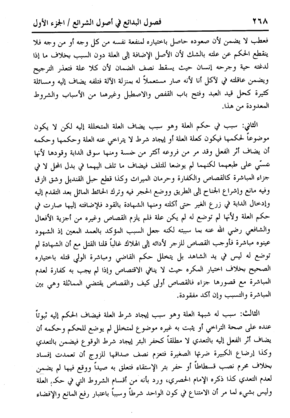 الثالث: سبب له شبهة العلة وهو سبب إيجاد شرط العلة فيضاف الحكم إليه ثبوتًا عنده على صحة التراخي أو يثبت به غيره موضوع لمتخلل لم يوضع للحكم وحكمه أن يضاف أثر الفعل إليه بالتعدي لا مطلقًا كحفر البئر إيجاد شرط الوقوع فيضمن بالتعدي وكذا إرضاع الكبيرة ضرتها الصغيرة فتعزم نصف صداقها للزوج أن تعمدت إفساد بخلاف محرم نصب قسطاطًا أو حفر بئر الإستقاء فتعلق به صيدًا ووقع فيها لم يضمن لعدم التعدي كذا ذكره الإِمام الحصري، ورد بأنه من أقسام الشروط التي في حكم العلة وليس بشيء لما مر أن الامتناع في كون الواحد شرطًا وسببًا باعتبار رفع المانع والإفضاء