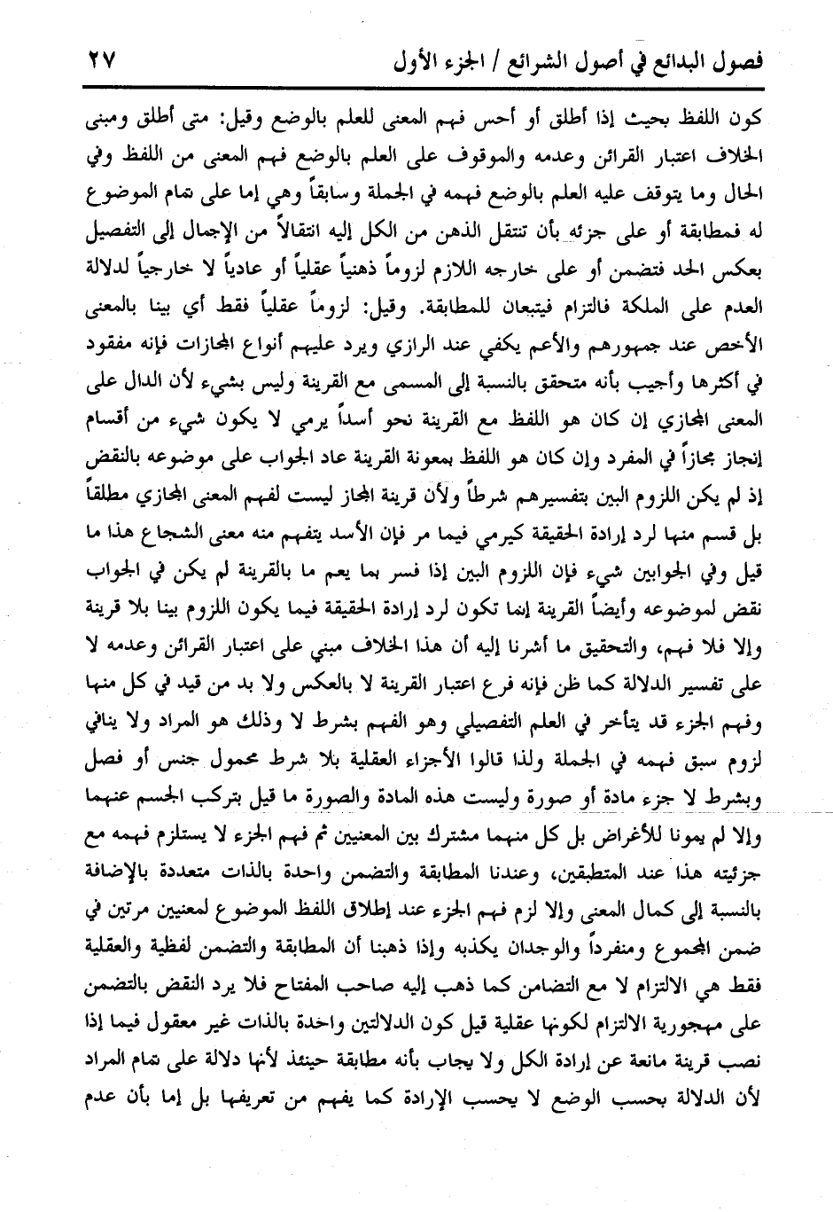 كون اللفظ بحيث إذا أطلق أو أحس فهم المعنى للعلم بالوضع وقيل: متى أطلق ومبنى الخلاف اعتبار القرائن وعدمه والموقوف على العلم بالوضع فهم المعنى من اللفظ وفي الحال وما يتوقف عليه العلم بالوضع فهمه في الجملة وسابقًا وهي إما على تمام الموضوع له فمطابقة أو على جزئه بأن تنتقل الذهن من الكل إليه انتقالًا من الإجمال إلى التفصيل بعكس الحد فتضمن أو على خارجه اللازم لزومًا ذهنيًا عقليًا أو عاديًا لا خارجيًا لدلالة العدم على الملكة فالتزام فيتبعان للمطابقة. وقيل: لزومًا عقليًا فقط أي بينا بالمعنى الأخص عند جمهورهم والأعم يكفي عند الرازي ويرد عليهم أنواع المجازات فإنه مفقود في أكثرها وأجيب بأنه متحقق بالنسبة إلى المسمى مع القرينة وليس بشيء لأن الدال على المعنى المجازي إن كان هو اللفظ مع القرينة نحو أسدًا يرمي لا يكون شيء من أقسام إنجاز مجازًا في المفرد وإن كان هو اللفظ بمعونة القرينة عاد الجواب على موضوعه بالنقض إذ لم يكن اللزوم البين بتفسيرهم شرطًا ولأن قرينة المجاز ليست لفهم المعنى المجازي مطلقًا بل قسم منها لرد إرادة الحقيقة كيرمي فيما مر فإن الأسد يتفهم منه معنى الشجاع هذا ما قيل وفي الجوابين شيء فإن اللزوم البين إذا فسر بما يعم ما بالقرينة لم يكن في الجواب نقض لموضوعه وأيضًا القرينة إنما تكون لرد إرادة الحقيقة فيما يكون اللزوم بينا بلا قرينة وإلا فلا فهم، والتحقيق ما أشرنا إليه أن هذا الخلاف مبني على اعتبار القرائن وعدمه لا على تفسير الدلالة كما ظن فإنه فرع اعتبار القرينة لا بالعكس ولا بد من قيد في كل منها وفهم الجزء قد يتأخر في العلم التفصيلي وهو الفهم بشرط لا وذلك هو المراد ولا ينافي لزوم سبق فهمه في الجملة ولذا قالوا الأجزاء العقلية بلا شرط محمول جنس أو فصل وبشرط لا جزء مادة أو صورة وليست هذه المادة والصورة ما قيل بتركب الجسم عنهما وإلا لم يمونا للأغراض بل كل منهما مشترك بين المعنين ثم فهم الجزء لا يستلزم فهمه مع جزئيته هذا عند المتطبقين، وعندنا المطابقة والتضمن واحدة بالذات متعددة بالإضافة بالنسبة إلى كمال المعنى وإلا لزم فهم الجزء عند إطلاق اللفظ الموضوع لمعنيين مرتين في ضمن المجموع ومنفردًا والوجدان يكذبه وإذا ذهبنا أن المطابقة والتضمن لفظية والعقلية فقط هي الالتزام لا مع التضامن كما ذهب إليه صاحب المفتاح فلا يرد النقض بالتضمن على مهجورية الالتزام لكونها عقلية قيل كون الدلالتين واحدة بالذات غير معقول فيما إذا نصب قرينة مانعة عن إرادة الكل ولا يجاب بأنه مطابقة حينئذ لأنها دلالة على تمام المراد لأن الدلالة بحسب الوضع لا يحسب الإرادة كما يفهم من تعريفها بل إما بأن عدم