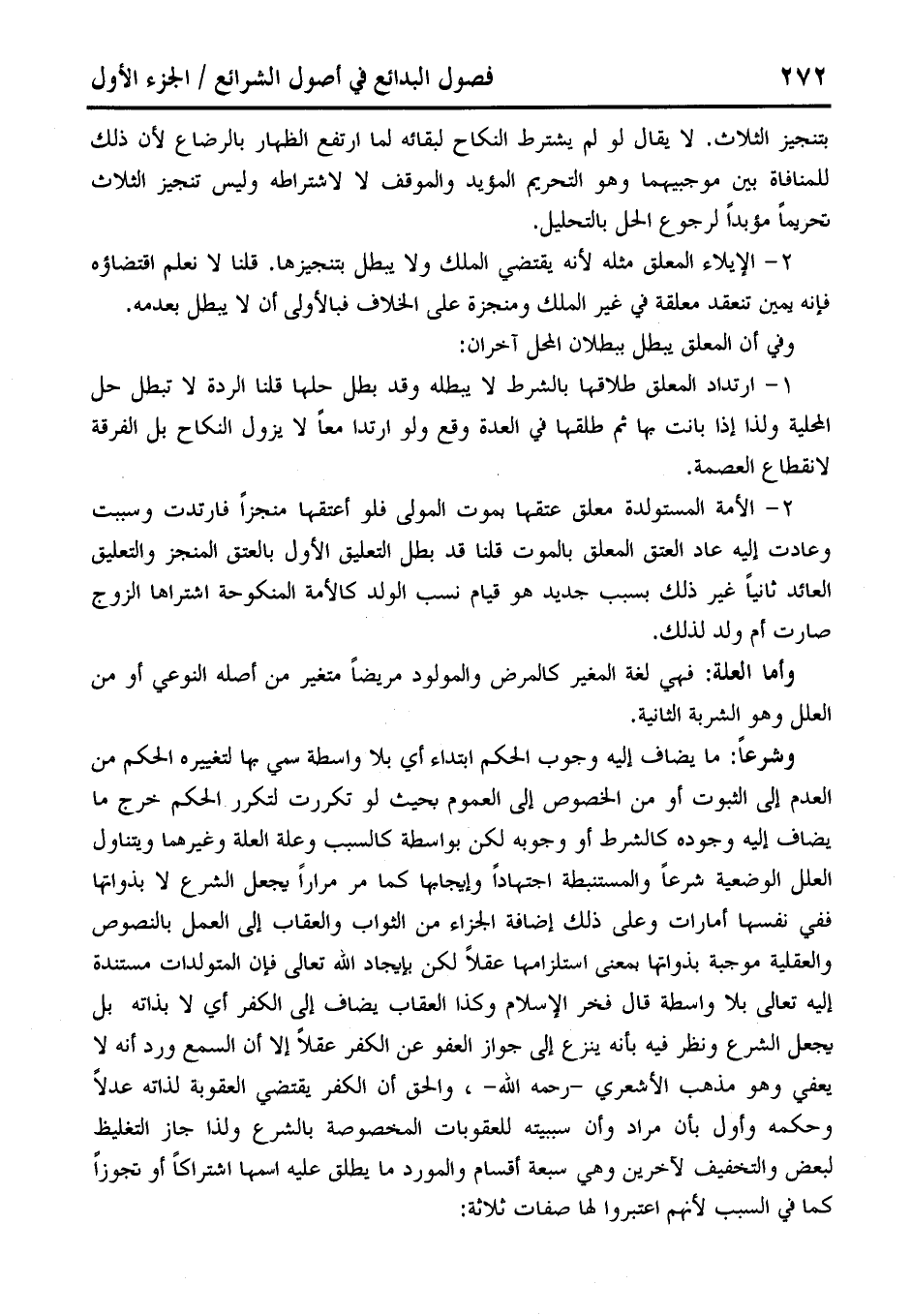 وأما العلة: فهي لغة المغير كالمرض والمولود مريضًا متغير من أصله النوعي أو من العلل وهو الشربة الثانية. وشرعًا: ما يضاف إليه وجوب الحكم ابتداء أي بلا واسطة سمي بها لتغييره الحكم من العدم إلى الثبوت أو من الخصوص إلى العموم بحيث لو تكررت لتكرر الحكم خرج ما يضاف إليه وجوده كالشرط أو وجوبه لكن بواسطة كالسبب وعلة العلة وغيرهما ويتناول العلل الوضعية شرعًا والمستنبطة اجتهادًا وإيجابها كما مر مرارًا يجعل الشرع لا بذواتها ففي نفسها أمارات وعلى ذلك إضافة الجزاء من الثواب والعقاب إلى العمل بالنصوص والعقلية موجبة بذواتها بمعنى استلزامها عقلًا لكن بإيجاد الله تعالى فإن المتولدات مستندة إليه تعالى بلا واسطة قال فخر الإِسلام وكذا العقاب يضاف إلى الكفر أي لا بذاته بل يجعل الشرع ونظر فيه بأنه ينزع إلى جواز العفو عن الكفر عقلًا إلا أن السمع ورد أنه لا يعفي وهو مذهب الأشعري - رحمه الله -، والحق أن الكفر يقتض العقوبة لذاته عدلًا وحكمه وأول بأن مراد وأن سببيته للعقوبات المخصوصة بالشرع ولذا جاز التغليظ لبعض والتخفيف لآخرين وهي سبعة أقسام والمورد ما يطلق عليه اسمها اشتراكًا أو تجوزًا كما في السبب لأنهم اعتبروا لها صفات ثلاثة: