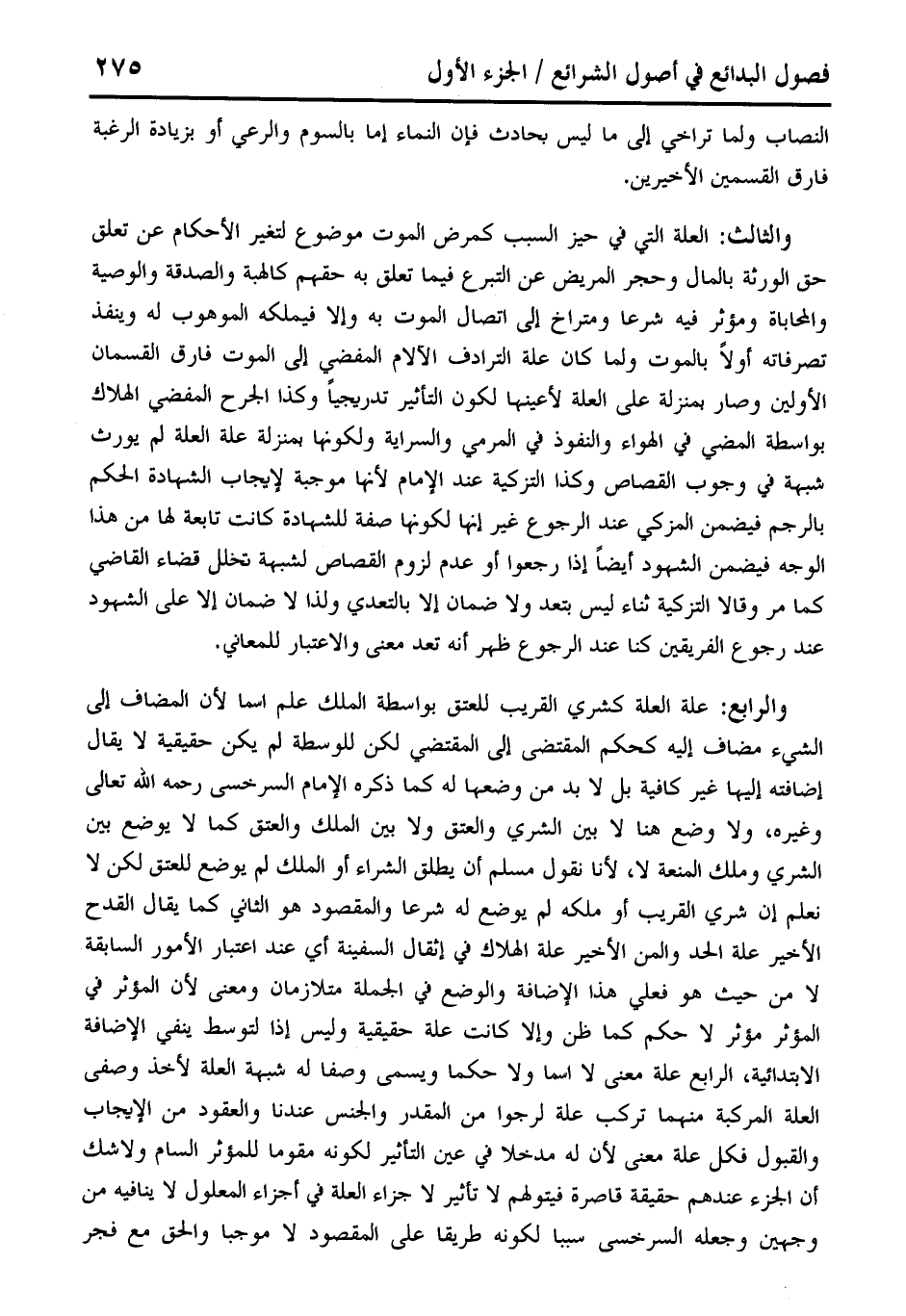 والثالث: العلة التي في حيز السبب كمرض الموت موضوع لتغير الأحكام عن تعلق حق الورثة بالمال وحجر المريض عن التبرع فيما تعلق به حقهم كالهبة والصدقة والوصية والمحاباة ومؤثر فيه شرعا ومتراخ إلى اتصال الموت به وإلا فيملكه الموهوب له وينفذ تصرفاته أولًا بالموت ولما كان علة الترادف الآلام المفض إلى الموت فارق القسمان الأولين وصار بمنزلة على العلة لأعينها لكون التأثير تدريجيًا وكذا الجرح المفضي الهلاك بواسطة المضي في الهواء والنفوذ في المرمي والسراية ولكونها يمنزلة علة العلة لم يورث شبهة في وجوب القصاص وكذا التزكية عند الإِمام لأنها موجبة لإيجاب الشهادة الحكم بالرجم فيضمن المزكي عند الرجوع غير انها لكونها صفة للشهادة كانت متابعة لها من هذا الوجه فيضمن الشهود أيضًا إذا رجعوا أو عدم لزوم القصاص لشبهة تخلل قضاء القاضي كما مر وقالا التزكية ثناء ليس بتعد ولا ضمان إلا بالتعدي ولذا لا ضمان إلا على الشهود عند رجوع الفريقين كنا عند الرجوع ظهر أنه تعد معنى والاعتبار للمعافي.