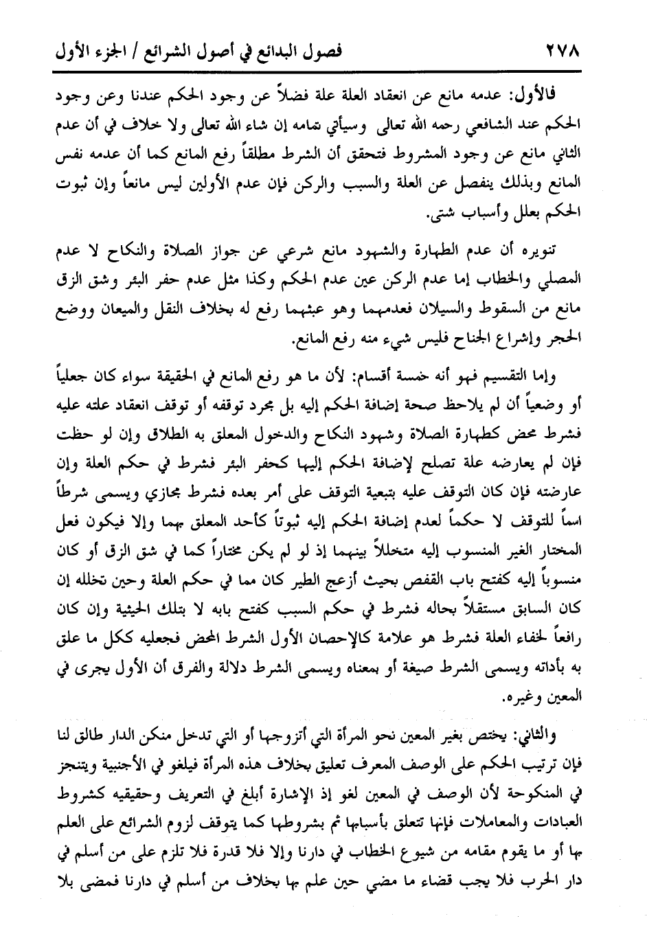فالأول: عدمه مانع عن انعقاد العلة علة فضلًا عن وجود الحكم عندنا وعن وجود الحكم عند الشافعي رحمه الله تعالى وسيأتي تمامه إن شاء الله تعالى ولا خلاف في أن عدم الثاني مانع عن وجود المشروط فتحقق أن الشرط مطلقًا رفع المانع كما أن عدمه نفس المانع وبذلك ينفصل عن العلة والسبب والركن فإن عدم الأولين ليس مانعًا وإن ثبوت الحكم بعلل وأسباب شتى.
