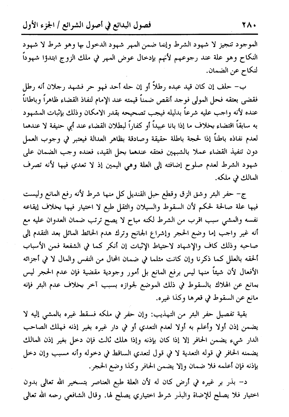 ج- حفر البئر وشق الزق وقطع حبل القنديل كل منها شرط لأنه رفع المانع وليست فيها علة صالحة لحكم لأن السقوط والسيلان والثقل طبع لا اختيار فيها بخلاف إيقاعه نفسه والمشي سبب أقرب من الشرط لكنه مباح لا يصح ترتب ضمان العدوان عليه مع أنه غير واجب إما وضع الحجر وإشراع الجانح وترك هدم الحائط الماثل بعد المتقدم إلى صاحبه وذلك كاف والإشهاد لاحتياط الإثبات إن أنكر كما في الشفعة فمن الأسباب ألحقه بالعلل كما ذكرنا وإن كانت مثلما في ضمان المحال من النفس والمال لا في أجزائه الأفعال لأن شيئًا منه إليس برفع المانع بل أمور وجودية مقضية فإن عدم الحجر ليس يمانع عن الهلاك بالسقوط في ذلك الموضع لجوازه بسبب آخر بخلاف عدم البئر فإنه مانع عن السقوط في قعرها وكذا غيره.