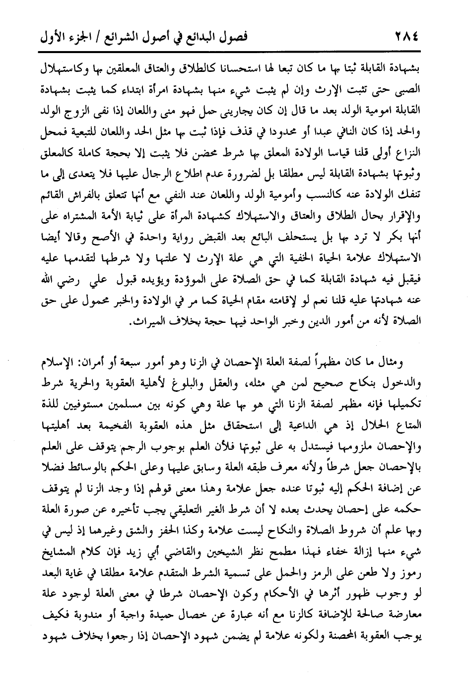ومثال ما كان مظهرًا لصفة العلة الإحصان في الزنا وهو أمور سبعة أو أمران: الإِسلام والدخول بنكاح صحيح لمن هي مثله، والعقل والبلوغ لأهلية العقوبة والحرية شرط تكميلها فإنه مظهر لصفة الزنا التي هو بها علة وهي كونه بين مسلمين مستوفين للذة المتاع الحلال إذ هي الداعية إلى استحقاق مثل هذه العقوبة الفخيمة بعد أهليتها والإحصان ملزومها فيستدل به على ثبوتا فلأن العلم بوجوب الرجم يتوقف على العلم بالإحصان جعل شرطًا ولأنه معرف طبقه العلة وسابق عليها وعلى الحكم بالوسائط فضلا عن إضافة الحكم إليه ثبوتا عنده جعل علامة وهذا معنى قولهم إذا وجد الزنا لم يتوقف حكمه على إحصان يحدث بعده لا أن شرط الغير التعليقي يجب تأخيره عن صورة العلة وجهًا علم أن شروط الصلاة والنكاح ليست علامة وهذا الحفز والشق وغيرهما إذ ليس في شيء منها إزالة خفاء فهذا مطمح نظر الشيخين والقاضي أبي زيد فإن كلام المشايخ رموز ولا طعن علي الرمز والحمل على تسمية الشرط المتقدم علامة مطلقا في غاية البعد لو وجوب ظهور أثره إلي الأحكام وكون الاحصان شرطا في معنى العلة لوجود علة معارضة صالحة للإضافة كالزنا مع أنه عبارة عن خصال حميدة واجبة أو مندوبة فكيف يوجب العقوبة المحصنة ولكونه علامة لم يضمن شهود الإحصان إذا رجعوا بخلاف شهود