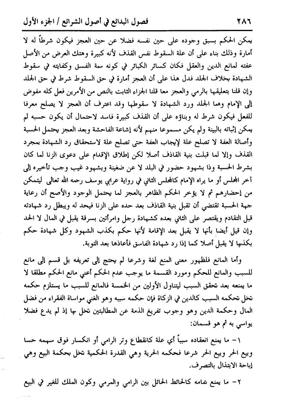 يمكن الحكم بسبق وجوده على حين نفسه فضلا عن حسن العجز فيكون شرطًا له لا أمارة وذلك بناء على أن علة السقوط نفس القذف لأنه كبيرة وهتك العرض من الأصل عفته لمانع الدين والعقل فكان كسائر الكبائر في كونه سمة الفسق وكفايته في سقوط الشهادة بخلاف الجلد فدل هذا على أن العجز أمارة في حق السقوط شرط في حق الجلد وإن قلنا بتعليقها بالرمي والعجز معا قلنا الجزاء الثابت بالنص من الأمرين فعل كله مفوض إلى الإمام وهما الجلد ورد الشهادة لا سقوطها وقد اعترف أن العجز لا يصلح معرفا للفعل فيكون شرط له وبناؤه على أن القذف كبيرة فاسد لاحتمال أن يكون حسبه لم يمكن إثباته بالبينة ولم يكن مسموعا منهم لأنه إشاعة الفاحشة وبعد العجز يحتمل الحسبة وأصالة العفة لا تصلح علة لإيجاب العفة حتى تصلح علة لاستحقاق رد الشهادة كمجرد القذف وإلا لما قبلت بنية القاذف أصلًا لكن إطلاق الإقدام على دعوى الزنا لما كان بشرط الحسبة وذا بشهود حضور في البلد لا عن ضغينة وبشهود غيب وجب تأخيره إلى آخر المجلس أو ما يراه الإِمام كالمجلس الثاني في رواية عرابي يوسف رحمه الله تعالى ليتمكن من إحضارهم ثم لا يوخر الحكم الظاهر بالعجز لما يحتمل الوجود والأصح أن رعاية جهة الحسبة تقتض أن تقبل بنية القاذف بعد حده على الزنا فيحد له ويبطل رد شهادته قبل التقادم ويقتصر على الثاني بعده كشهادة رجل وامرأتين بسرقة يقبل في المال لا الحد وان قيل أيضًا بأنها لا يقبل بعد الإقامة لأنها حكم بكذب الشهود وكل شهادة حكم بكذبها لا يقبل أصلًا كما إذا رد شهادة الفاسق فأعاذها بعد التوبة. وأما المانع فلظهور معنى المنع لغة وشرعا لم يحتج إلى تعريفه بل قسم إلى مانع للسبب والمانع للحكم ومورد القسمة ما يوجب عدم الحكم أعني مانع الحكم مطلقا لا ما يمنعه بعد تحقق السبب ليتناول الأولين من الخمسة فالمانع للسبب ما يستلزم حكمه تخل تحكمه السبب كالدين في الزكاة فإن حكمه سببه وهو الغني مواساة الفقراء من فضل المال وحكمة الدين وهو وجوب تفريجِ الذمة عن المطالبتين تخل بها إذ لم يدع فضلا يواسي به ثم هو قسمان: