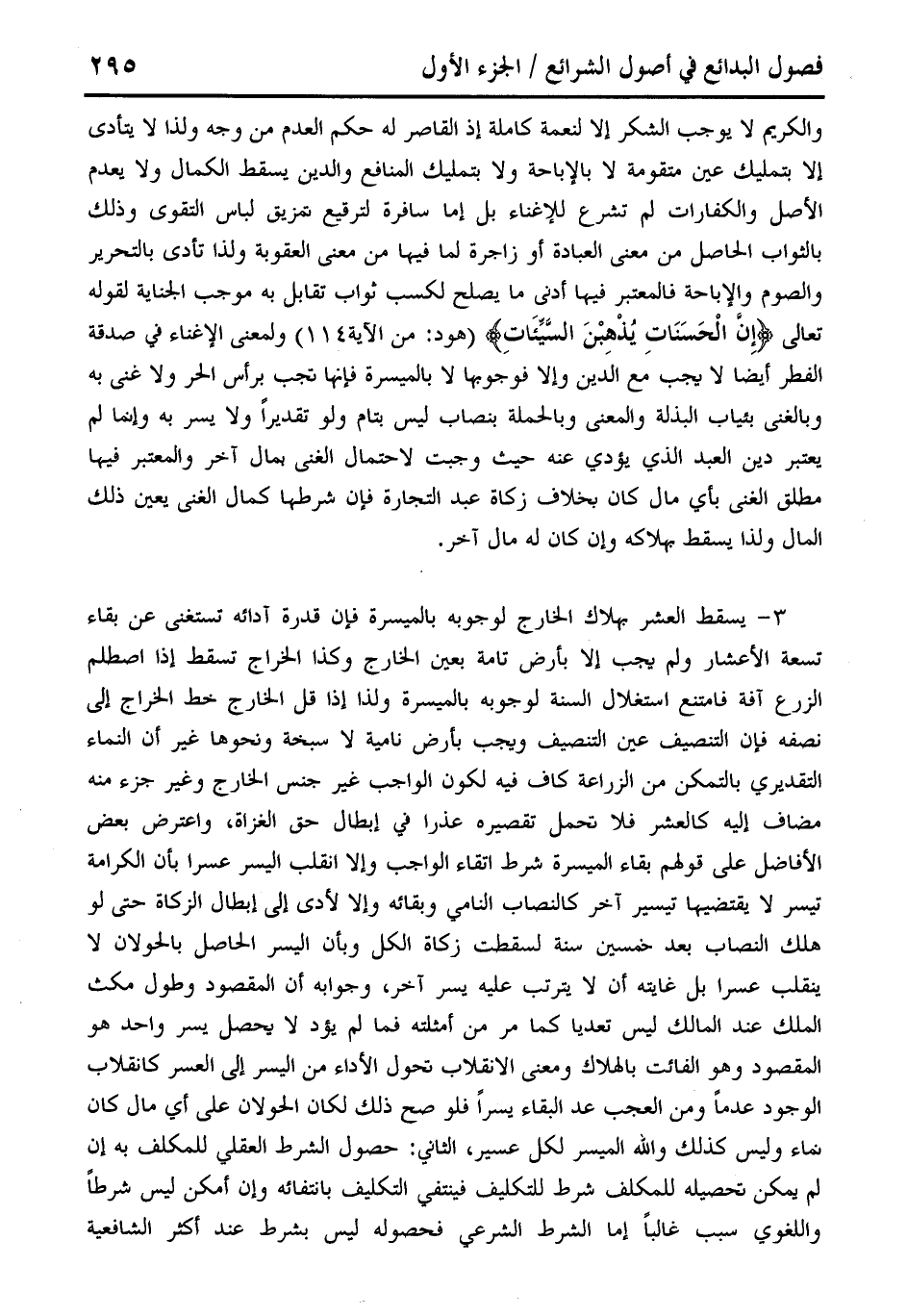 3 - يسقط العشر بهلاك الخارج لوجوبه بالميسرة فإن قدرة آدائه تستغنى عن بقاء تسعة الأعشار ولم يجب إلا بأرض تامة بعين الخارج وكذا الخراج تسقط إذا اصطلم الزرع آفة فامتنع استغلال السنة لوجوبه بالميسرة ولذا إذا قل الخارج خط الخراج إلى نصفه فإن التنصيف عين التنصيف ويجب بأرض نامية لا سبخة ونحوها غير أن النماء التقديري بالتمكن من الزراعة كاف فيه لكون الواجب غير جنس الخارج وغير جزء منه مضاف إليه كالعشر فلا تحمل تقصيره عذرا في إبطال حق الغزاة، واعترض بعض الأفاضل على قولهم بقاء الميسرة شرط اتقاء الواجب وإلا انقلب اليسر عسرا بأن الكرامة تيسر لا يقتضيها تيسير آخر كالنصاب النامي وبقائه وإلا لأدى إلى إبطال الزكاة حتى لو هلك النصاب بعد خمسين سنة لسقطت زكاة الكل وبأن اليسر الحاصل بالحولان لا ينقلب عسرا بل غايته أن لا يترتب عليه يسر آخر، وجوابه أن المقصود وطول مكث الملك عند المالك ليس تعديا كما مر من أمثلته فما لم يؤد لا يحصل يسر واحد هو المقصود وهو الفائت بالهلاك ومعنى الانقلاب تحول الأداء من اليسر إلى العسر كانقلاب الوجود عدمًا ومن العجب عد البقاء يسرًا فلو صح ذلك لكان الحولان على أي مال كان نماء وليس كذلك والله الميسر لكل عسير، الثاني: حصول الشرط العقلي للمكلف به إن لم يمكن تحصيله للمكلف شرط للتكليف فينتفي التكليف بانتفائه وإن أمكن ليس شرطًا واللغوي سبب غالبًا إما الشرط الشرعي فحصوله ليس بشرط عند أكثر الشافعية