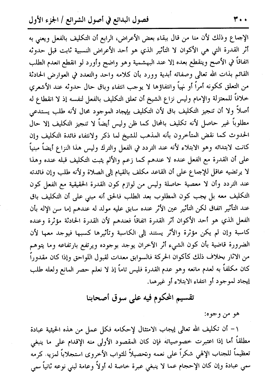 الإجماع وذلك لأن منا من قال ببقاء بعض الأعراض، الرابع أن التكليف بالفعل ويعني به أثر القدرة التي هي الأكوان لا التأثير الذي هو أحد الأعراض النسبية ثابت قبل حدوثه اتفاقًا في الأصح وينقطع بعده إلا عند البهشمية وهو واضح وأورد لو انقطح انعدم الطلب القائم بذات الله تعالى وصفاته أبدية وورد بأن كلامه واحد والتعدد في العوارض الحادثة من التعلق ككونه أمرًا أو نهيًا وانتفاؤها لا يوبا انتفاء وباق حال حدوثه عند الأشعري خلافًا للمعتزلة والإمام وليس نزاع الشيخ أن تعلق التكليف بالفعل لنفسه إذ لا انقطاع له أصلًا ولا أن تنجيز التكليفى باق لأن التكليف بإيجاد الموجود محال لأنه طلب يستدعي مطلوبًا غير حاصل لأنه تكليف بالمحال كما ظن وليس أيضًا لا تنجيز التكليف إلا حال الحدوث كما نقض المتأخرون بأنه المذهب للشيخ لما ذكر ولانتفاء فائدة التكليف وإن كانت لابتدائه وهو الابتلاء لأنه عند التردد في الفعل والترك وليس هذا النزاع أيضًا مبنيًا على أن القدرة مع الفعل عنده لا عندهم كما زعم والألم يثبت التكليف قبله عنده وهذا لا يرتضيه عاقل للإجماع على أن القاعد مكلف بالقيام إلى الصلاة ولأنه طلب وإن فائدته عند التردد وأن لا معصية حاصلة وليس من لوازم كون القدرة الحقيقية مع الفعل كون التكليف معه بل بجب كون المطلوب بعد الطلب فالحق أنه مبنى على أن التكليف باق عند التأثير اتفاق لكن التأثير عين الأثر عنده سابق عليه مولد له عندهم إما سن الإله بأن الفعل الذي هو أحد الأكوان أثر القدرة اتفاقًا فعندهم لأن القدرة الحادثة مؤثرة وعنده كاسبة وإن لم يكن مؤثرة والأثر يستند إلى الكاسبة وتأثيرها كسبها فيوجد معها لأن الضرورة قاضية بأن كون الشىء أثر الأخران يوجد بوجوده ويرتفع بارتفاعه وما يتوهم من الآثار بخلاف ذلك كأكوان الحركة فالسوابق معدات لقبول اللواحق وإذا كان مقدورًا كان مكلفًا به لعدم مانعه وهو عدم القدرة فليس تامًا إذ لا نعلم حصر المانع ولعله طلب إيجاد لموجود أو انتفاء الابتلاء أو غيرهما.