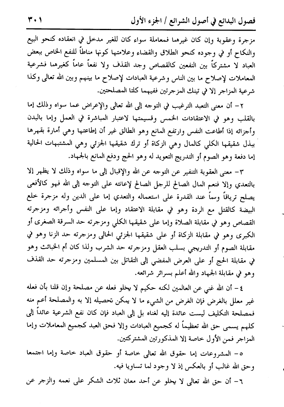 4 - أن الله غني عن العالمين لكنه حكيم لا يخلو فعله عن مصلحة وإن قلنا بأن فعله غير معلل بالغرض فإن الغرض من الشيء ما لا يمكن تحصيله إلا به والمصلحة أعم منه فمصلحة التكليف ليست عائدة إليه لغناه بل إلى العباد فإن كان نفع الشرعية عائدًا إلى كلهم يسمى حق الله تعطمًا له كجميع العبادات وإلا فحق العبد كجميع المعاملات وإما المزاجر فمن الأول خاصة إلا المذكورتين المشتركتين.