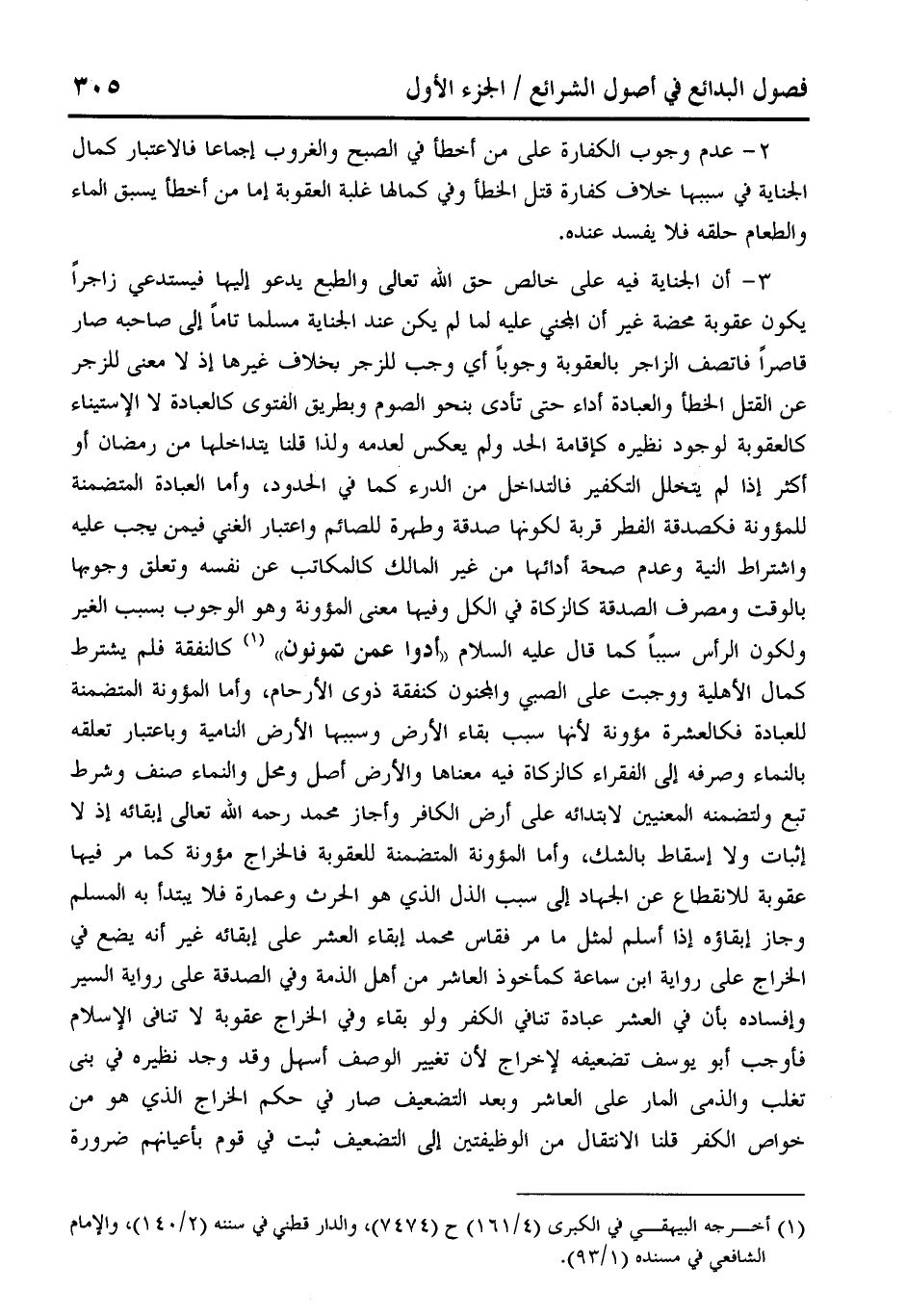 3 - أن الجناية فيه على خالص حق الله تعالى والطبع يدعو إليها فيستدعي زاجرًا يكون عقوبة محضة غير أن المجني عليه لما لم يكن عند الجناية مسلما تامًا إلى صاحبه صار قاصرًا فاتصف الزاجر بالعقوبة وجوبًا أي وجب للزجر بخلاف غيرها إذ لا معنى للزجر عن القتل الخطأ والعبادة أداء حتى تأدى بنحو الصوم وبطريق الفتوى كالعبادة لا الاستيناء كالعقوبة لوجود نظيره كإقامة الحد ولم يعكس لعدمه ولذا قلنا يتداخلها من رمضان أو أكثر إذا لم يتخلل التكفير فالتداخل من الدرء كما في الحدود، وأما العبادة المتضمنة للمؤونة فكصدقة الفطر قربة لكونها صدقة وطهرة للصائم واعتبار الغني فيمن يجب عليه واشتراط النية وعدم صحة أدائها من غير المالك كالمكاتب عن نفسه وتعلق وجوبها بالوقت ومصرف الصدقة كالزكاة في الكل وفيها معنى الموونة وهو الوجوب بسبب الغير ولكون الرأس سببًا كما قال عليه السلام "أدوا عمن تمونون" (¬1) كالنفقة فلم يشترط كمال الأهلية ووجبت على الصبي والمجنون كنفقة ذوى الأرحام، وأما الموونة المتضمنة للعبادة فكالعشرة موونة لأنها سبب بقاء الأرض وسببها الأرض النامية وباعتبار تعلقه بالنماء وصرفه إلى الفقراء كالزكاة فيه معناها والأرض أصل ومحل والنماء صنف وشرط تبع ولتضمنه المعنيين لابتدائه على أرض الكافر وأجاز محمَّد رحمه الله تعالى إبقائه إذ لا إثبات ولا إسقاط بالشك، وأما المؤونة المتضمنة للعقوبة فالخراج مؤونة كما مر فيها عقوبة للانقطاع عن الجهاد إلى سبب الذل الذي هو الحرث وعمارة فلا يبتدأ به المسلم وجاز إبقاؤه إذا أسلم لمثل ما مر فقاس محمَّد إبقاء العشر على إبقائه غير أنه يضع في الخراج على رواية ابن سماعة كمأخوذ العاشر من أهل الذمة ودق الصدقة على رواية السير وإفساده بأن في العشر عبادة تنافي الكفر ولو بقاء وفي الخراج عقوبة لا تنافى الإِسلام فأوجب أبو يوسف تضعيفه لإخراج لأن تغيير الوصف أسهل وقد وجد نظيره في بني تغلب والذمي المار على العاشر وبعد التضعيف صار في حكم الخراج الذي هو من خواص الكفر قلنا الانتقال من الوظيفتين إلى التضعيف ثبت في قوم بأعيانهم ضرورة