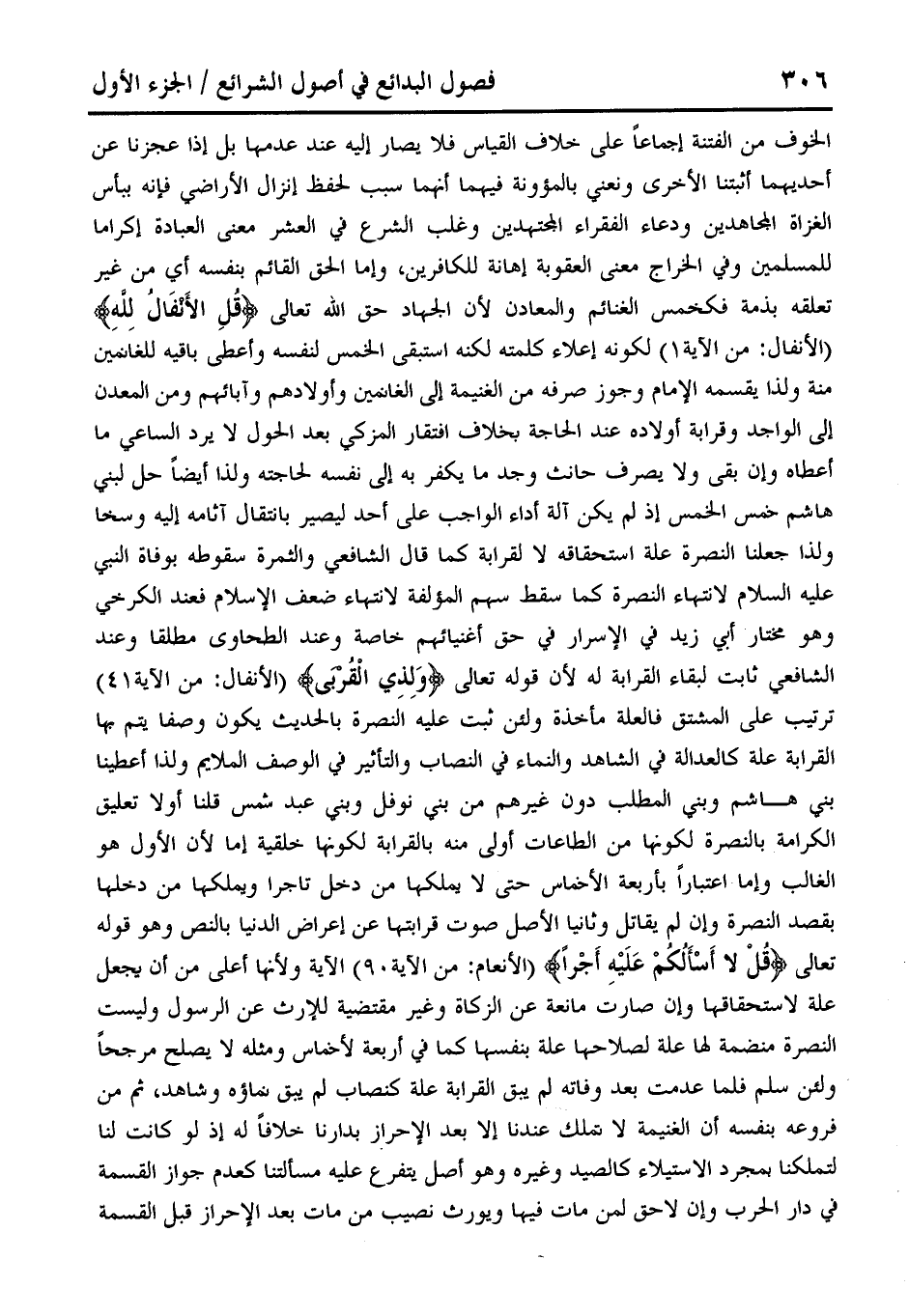 الخوف من الفتنة إجماعًا على خلاف القياس فلا يصار إليه عند عدمها بل إذا عجزنا عن أحديهما أثبتنا الأخرى ونعني بالمؤونة فيهما أنهما سبب لحفظ انزال الأراض فإنه ببأس الغزاة المجاهدين ودعاء الفقراء المجتهدين وغلب الشرع في العشر معنى العبادة إكراما للمسلمين وفي الخراج معنى العقوبة إهانة للكافرين، وإما الحق القائم بنفسه أي من غير تعلقه بذمة فكخمس الغنائم والمعادن لأن الجهاد حق الله تعالى {قُلِ الْأَنْفَالُ لِلَّهِ} (الأنفال: من الآية 1) لكونه إعلاء كلمته لكنه استبقى الخمس لنفسه وأعطى باقيه للغانمين منة ولذا يقسمه الإمام وجوز صرفه من الغنيمة إلى الغالفين وأولادهم وآبائهم ومن المعدن إلى الواجد وقرابة أولاده عند الحاجة بخلاف افتقار المزكي بعد الحول لا يرد الساعي ما أعطاه وان بقى ولا يصرف حانث وجد ما يكفر به إلى نفسه لحاجته ولذا أيضًا حل لبني هاشم خمس الخمس إذ لم يكن آلة أداء الواجب على أحد ليصير بانتقال آثامه إليه وسخا ولذا جعلنا النصرة علة استحقاقه لا لقرابة كما قال الشافعي والثمرة سقوطه بوفاة النبي عليه السلام لانتهاء النصرة كما سقط سهم المولفة لانتهاء ضعف الإِسلام فعند الكرخي وهو مختار أبي زيد في الإسرار في حق أغنيائهم خاصة وعند الطحاوي مطلقا وعند الشافعي ثابت لبقاء القرابة له لأن قوله تعالى {وَلِذِي الْقُرْبَى} (الأنفال: من الآية 41) ترتيب على المشتق فالعلة مأخذة ولئن ثبت عليه اَلنصرة بالحديث يكون وصفا يتم بها القرابة علة كالعدالة في الشاهد والنماء في النصاب والتأثير في الوصف الملايم ولذا أعطنا بني هاشم وبني المطلب دون غيرهم من بني نوفل وبني عبد شمس قلنا أولًا تعليق الكرامة بالنصرة لكونها من الطاعات أولى منه بالقرابة لكونها خلقية إما لأن الأول هو الغالب وإما اعتبارًا بأربعة الأخماس حتى لا يملكها من دخل تاجرا ويملكها من دخلها بقصد النصرة وان لم يقاتل وثانيا الأصل صوت قرابتها عن إعراض الدنيا بالنص وهو قوله تعالى {قُلْ لا أَسْأَلُكُمْ عَلَيْهِ أَجْرًا} (الأنعام: من الآية 90) الآية ولأنها أعلى من أن يجعل علة لاستحقاقها وإن صارت مانعة عن الزكاة وغير مقتضية للإرث عن الرسول وليست النصرة منضمة لها علة لصلاحها علة بنفسها كما في أربعة لأخماس ومثله لا يصلح مرجحًا ولكن سلم فلما عدمت بعد وفاته لم يبق القرابة علة كنصاب لم يبق نماؤه وشاهد، ثم من فروعه بنفسه أن الغنيمة لا تملك عندنا إلا بعد الإحراز بدارنا خلافًا له إذ لو كانت لنا لتملكنا بمجرد الاستيلاء كالصيد وغيره وهو أصل يتفرع عليه مسألتنا كعدم جواز القسمة في دار الحرب وإن لاحق لمن مات فيها ويورث نصيب من مات بعد الإحراز قبل القسمة