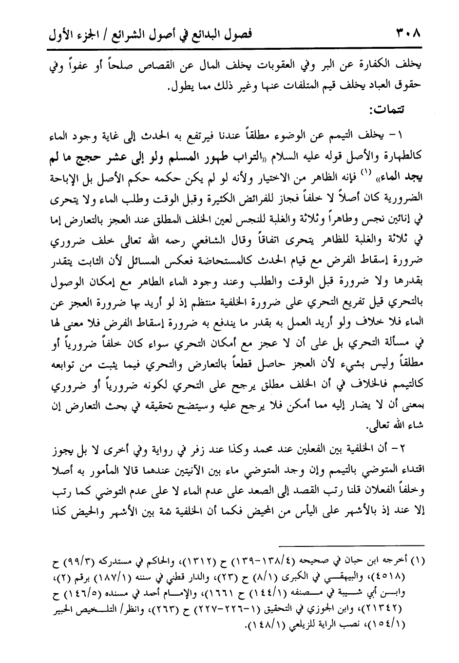 2 - أن الخلفية بين الفعلين عند محمَّد وكذا عند زفر في رواية وفي أخرى لا بل يجوز اقتداء المتوضي بالتيمم وإن وجد المتوضى ماء بين الأنيتين عندهما قالا المأمور به أصلًا وخلفًا الفعلان قلنا رتب القصد إلى الصعد على عدم الماء لا على عدم التوضى كما رتب إلا عند إذ بالأشهر على اليأس من المحيض فكما أن الخلفية ثمة بين الأشهر والحيض كذا