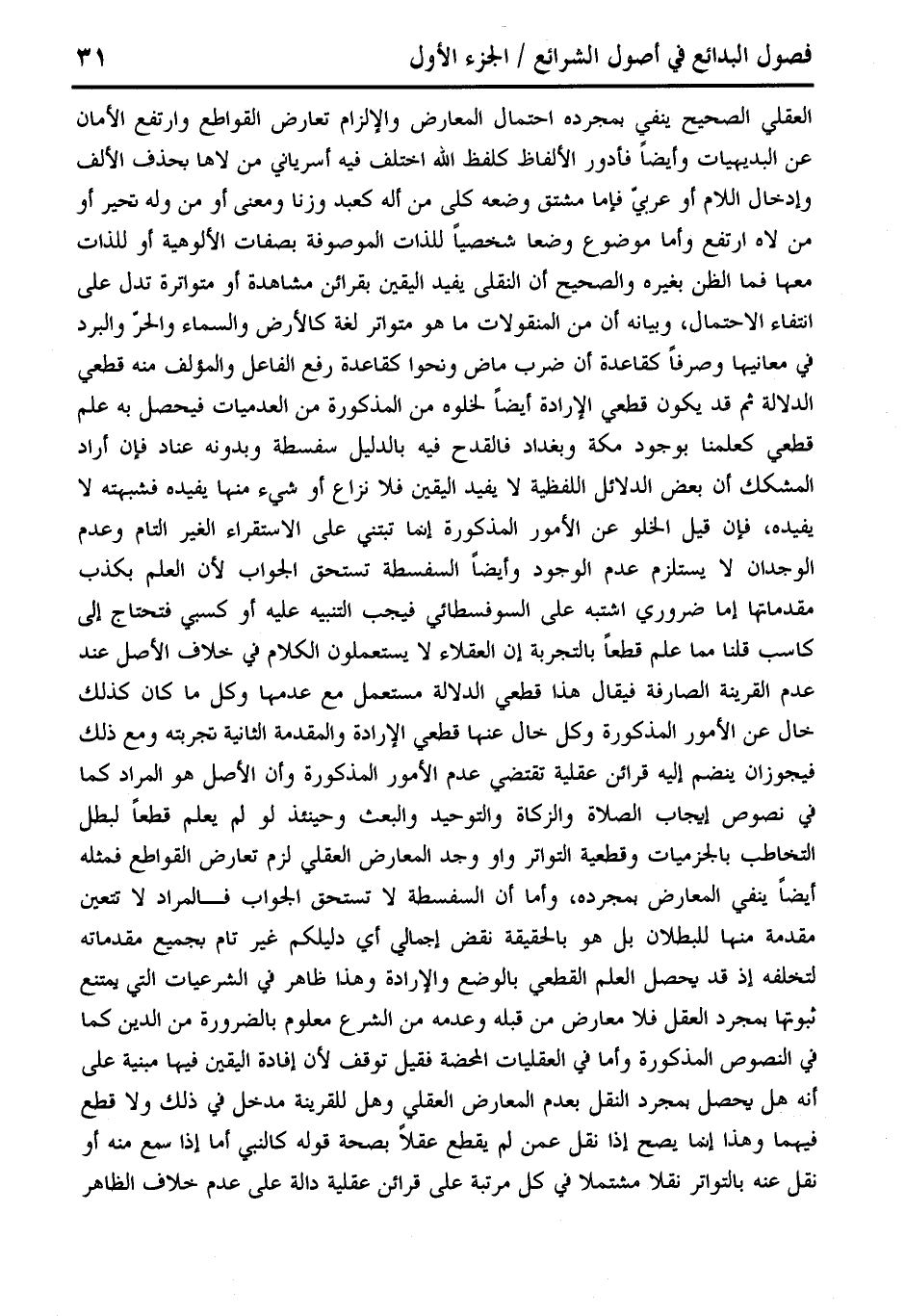 العقلي الصحيح ينفي بمجرده احتمال المعارض والإلزام تعارض القواطع وارتفع الأمان عن البديهيات وأيضًا فأدور الألفاظ كلفظ الله اختلف فيه أسرياني من لاها بحذف الألف وإدخال اللام أو عربيّ فإما مشتق وضعه كلي من أله كعبد وزنا ومعنى أو من وله تحير أو من لاه ارتفع وأما موضوع وضعا شخصيًا للذات الموصوفة بصفات الألوهية أو للذات معها فما الظن بغيره والصحيح أن النقلي يفيد اليقين بقرائن مشاهدة أو متواترة تدل على انتفاء الاحتمال، وبيانه أن من المنقولات ما هو متواتر لغة كالأرض والسماء والحرّ والبرد في معانيها وصرفًا كقاعدة أن ضرب ماض ونحوا كقاعدة رفع الفاعل والمؤلف منه قطعي الدلالة ثم قد يكون قطعي الإرادة أيضًا لخلوه من المذكورة من العدميات فيحصل به علم قطعي كعلمنا بوجود مكة وبغداد فالقدح فيه بالدليل سفسطة وبدونه عناد فإن أراد المشكك أن بعض الدلائل اللفظية لا يفيد اليقين فلا نزاع أو شيء منها يفيده فشبهته لا يفيده، فإن قيل الخلو عن الأمور المذكورة إنما تبتني على الاستقراء الغير التام وعدم الوجدان لا يستلزم عدم الوجود وأيضًا السفسطة تستحق الجواب لأن العلم بكذب مقدماتها إما ضروري اشتبه على السوفسطائي فيجب التنبيه عليه أو كسبي فتحتاج إلى كاسب قلنا مما علم قطعًا بالتجربة إن العقلاء لا يستعملون الكلام في خلاف الأصل عند عدم القرينة الصارفة فيقال هذا قطعي الدلالة مستعمل مع عدمها وكل ما كان كذلك خال عن الأمور المذكورة وكل خال عنها قطعي الإرادة والمقدمة الثانية تجربته ومع ذلك فيجوزان ينضم إليه قرائن عقلية تقتضي عدم الأمور المذكورة وأن الأصل هو المراد كما في نصوص إيجاب الصلاة والزكاة والتوحيد والبعث وحينئذ لو لم يعلم قطعًا لبطل التخاطب بالجزميات وقطعية التواتر واو وجد المعارض العقلي لزم تعارض القواطع فمثله أيضًا ينفي المعارض بمجرده، وأما أن السفسطة لا تستحق الجواب فالمراد لا تتعين مقدمة منها للبطلان بل هو بالحقيقة نقض إجمالي أي دليلكم غير تام بجميع مقدماته لتخلفه إذ قد يحصل العلم القطعي بالوضع والإرادة وهذا ظاهر في الشرعيات التي يمتنع ثبوتها بمجرد العقل فلا معارض من قبله وعدمه من الشرع معلوم بالضرورة من الدين كما في النصوص المذكورة وأما في العقليات المحضة فقيل توقف لأن إفادة اليقين فيها مبنية على أنه هل يحصل بمجرد النقل بعدم المعارض العقلي وهل للقرينة مدخل في ذلك ولا قطع فيهما وهذا إنما يصح إذا نقل عمن لم يقطع عقلًا بصحة قوله كالنبي أما إذا سمع منه أو نقل عنه بالتواتر نقلا مشتملا في كل مرتبة على قرائن عقلية دالة على عدم خلاف الظاهر