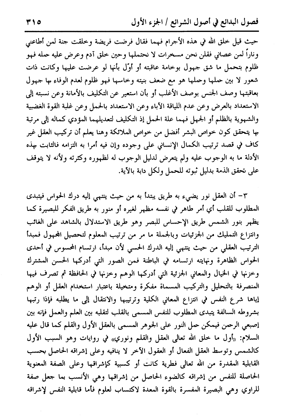 3 - أن العقل نور يضىء به طريق يبتدأ به من حيث ينتهي إليه درك الحواس فيتبدى المطلوب للقلب أي أمر طاهر في نفسه مظهر لغيره أو منور به طريق الفكر للبصيرة كما يظهر بنور الشمس طريق الإحساس للبصر وهو طريق الاستدلال بالشاهد على الغائب وانتزاع التمليك من الجزئيات وبالجملة ما مر من ترتيب المعلوم لتحصيل المجهول فمبدأ الترتيب العقلي من حيث ينتهي إليه الدرك الحسين لأن مبدأ، ارتسام المحسوس في أحدى الحواس الظاهرة ونهايته ارتسامه في الباطنة فمن الصور التي أدركها الحسن المشترك وخزنها في الخيال والمعاني الجزئية التي أدركها الوهم وخزنها في الحافظة ثم تصرف فيها المنصرفة بالتحليل والتركيب المسماة مفكرة ومتخيلة باعتبار استخدام العقل أو الوهم إياها شرع النفس في انتزاع المعاني الكلية وترتيبها والانتقال إلى ما يطلبه فإذا رتبها بشروطه السالفة يتبدى المطلوب للنفس المسمى بالقلب لتقلبه بين العلم والعمل فإنه بين إصبعي الرحمن فيمكن حمل النور على الجوهر المسمى بالعقل الأول والقلم كما قال عليه السلام: "أول ما خلق الله تعالى العقل والقلم ونوري" في روايات وهو السبب الأول كالشمس وتوسط العقل الفعال أو العقول الآخر لا ينافيه وعلى إشراقه الحاصل بحسب القابلية المقدرة من الله تعالى فطرية كانت أو كسبية كإشراقها وعلى الصفة المعنوية الحاصلة للنفس من إشراقه كالضوء الحاصل من إشراقها وهي الإنسب يما جعل صفة للراوي وهي البصيرة المفسرة بالقوة المعدة لاكتساب لعلوم فأما قابلية النفس لإشراقه