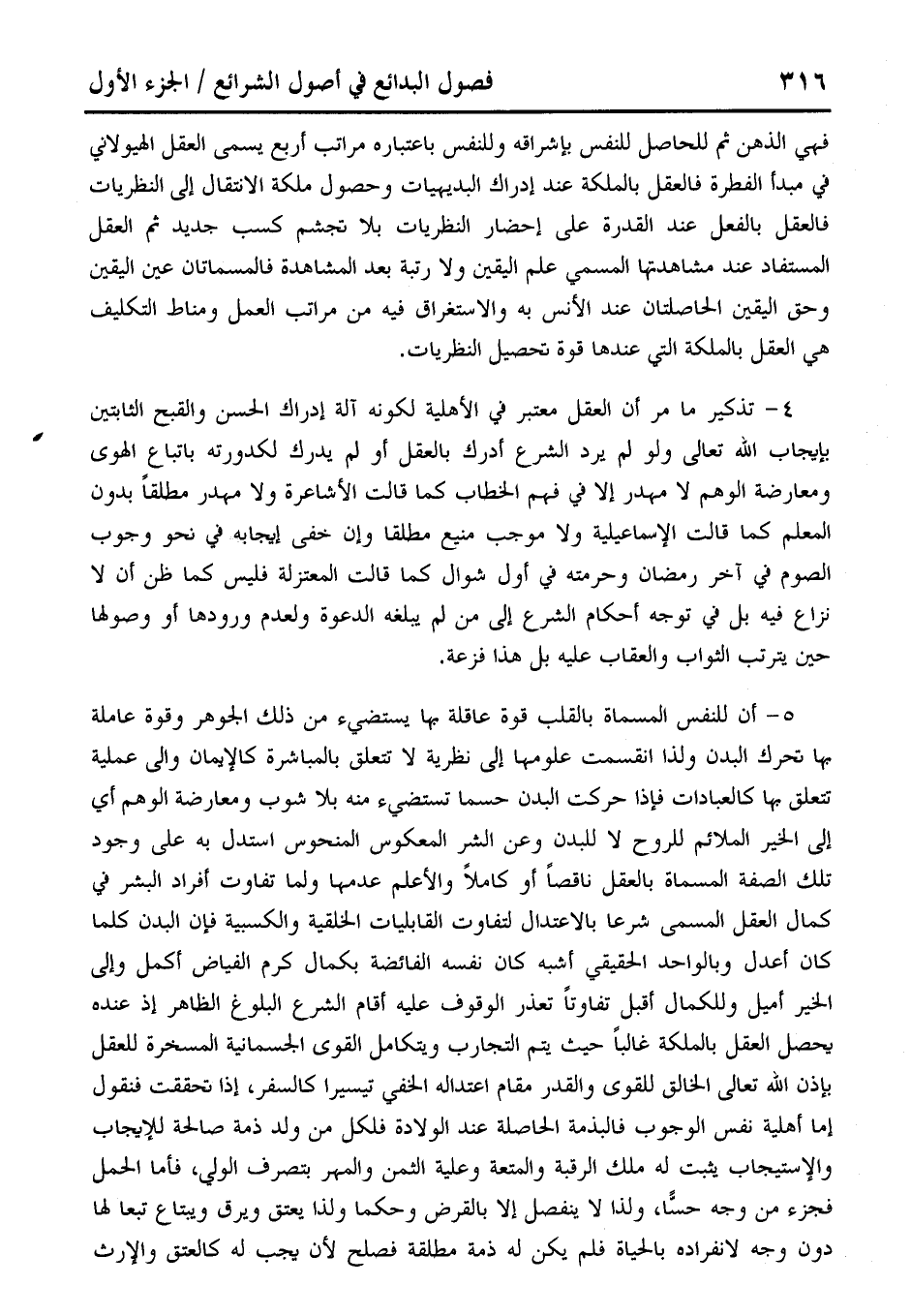 5 - أن للنفس المسماة بالقلب قوة عاقلة بها يستضيء من ذلك الجوهر وقوة عاملة بها تحرك البدن ولذا انقسمت علومها إلى نظرية لا تتعلق بالمباشرة كالإيمان وإلى عملية تتعلق بها كالعبادات فإذا حركت البدن حسما تستضيء منه بلا شوب ومعارضة الوهم أي إلى الخير الملائم للروح لا للبدن وعن الشر المعكوس المنحوس استدل به على وجود تلك الصفة المسماة بالعقل ناقصًا أو كاملًا والأعلم عدمها ولما تفاوت أفراد البشر في كمال العقل المسمى شرعا بالاعتدال لتفاوت القابليات الخلقية والكسبية فإن البدن كلما كان أعدل وبالواحد الحقيقي أشبه كان نفسه الفائضة بكمال كرم الفياض أكمل وإلى الخير أميل وللكمال أقبل تفاوتًا تعذر الوقوف عليه أقام الشرع البلوغ الظاهر إذ عنده يحصل العقل بالملكة غالبًا حيث يتم التجارب ويتكامل القوى الجسمانية المسخرة للعقل بإذن الله تعالى الخالق للقوى والقدر مقام اعتداله الخفي تيسيرا كالسفر، إذا تحققت فنقول إما أهلية نفس الوجوب فالبذمة الحاصلة عند الولادة فلكل من ولد ذمة صالحة للإيجاب والإستيجاب يثبت له ملك الرقبة والمتعة وعلية الثمن والمهر بتصرف الولي، فأما الحمل فجزء من وجه حسًّا، ولذا لا ينفصل إلا بالقرض وحكما ولذا يعتق ويرق ويبتاع تبعًا لها دون وجه لانفراده بالحياة فلم يكن له ذمة مطلقة فصلح لأن يجب له كالعتق والإرث