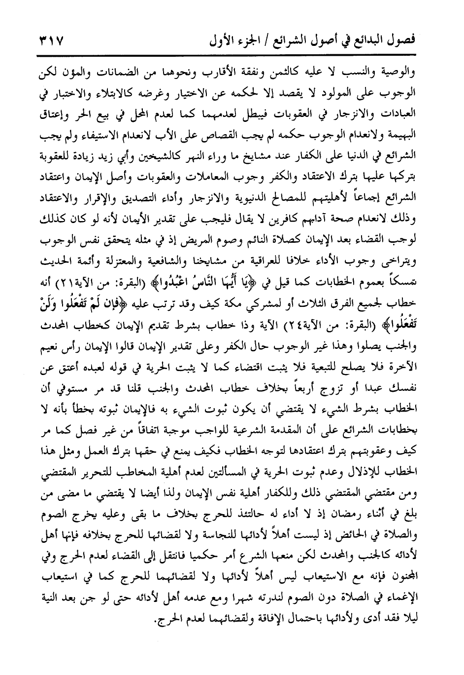 والوصية والنسب لا عليه كالثمن ونفقة الأقارب ونحوهما من الضمانات والمؤن لكن الوجوب على المولود لا يقصد إلا لحكمه عن الاختيار وغرضه كالابتلاء والاختبار في العبادات والإنزجار في العقوبات فيبطل لعدمهما كما لعدم المحل في بيع الحر وإعتاق البهيمة ولانعدام الوجوب حكمه لم يجب القصاص على الأب لانعدام الاستيفاء ولم يجب الشرائع في الدنيا على الكفار عند مشايخ ما وراء النهر كالشيخين وأبي زيد زيادة للعقوبة بتركها عليها بترك الاعتقاد والكفر وجوب المعاملات والعقوبات وأصل الإيمان واعتقاد الشرائع إجماعًا لأهليتهم للمصالح الدنيوية والانزجار وأداء التصديق والإقرار والاعتقاد وذلك لانعدام صحة آدابهم كافرين لا يقال فليجب على تقدير الأيمان لأنه لو كان كذلك لوجب القضاء بعد الإيمان كصلاة النائم وصوم المريض إذ في مثله يتحقق نفس الوجوب ويتراخى وجوب الأداء خلافا للعراقية من مشايخنا والشافعية والمعتزلة وأئمة الحديث تمسكًا بعموم الخطابات كما قيل في {يَا أَيُّهَا النَّاسُ اعْبُدُوا} (البقرة: من الآية 21) أنه خطاب لجميع الفرق الثلاث أو لمشركي مكة كيف وقد ترتب عليه {فَإِنْ لَمْ تَفْعَلُوا} (البقرة: من الآية 24) الآية وذا خطاب بشرط تقديم الإيمان كخطاب المحدث والجنب يصلوا وهذا غير الوجوب حال الكفر وعلى تقدير الإيمان قالوا الإيمان رأس نعيم الآخرة فلا يصلح للتبعية فلا يثبت اقتضاء كما لا يثبت الحرية في قوله لعبده أعتق عن نفسك عبدا أو تزوج أربعًا بخلاف خطاب المحدث والجنب قلنا قد مر مستوفي أن الخطاب بشرط الشيء لا يقتضي أن يكون ثبوت الشيء به فالإيمان ثبوته بخطأ بأنه لا بخطابات الشرائع على أن المقدمة الشرعية للواجب موجبة اتفاقًا من غير فصل كما مر كيف وعقوبتهم بترك اعتقادها لتوجه الخطاب فكيف يمنع في حقها بترك العمل ومثل هذا الخطاب للإذلال وعدم ثبوت الحرية في المسألتين لعدم أهلية المخاطب للتحرير المقتضي ومن مقتضي المقتضى ذلك وللكفار أهلية نفس الإيمان ولذا أيضًا لا يقتضى ما مضى من بلغ فني أثناء رمضان إذ لا أداء له حالتئذ للحرج بخلاف ما بقى وعليه يخرج الصوم والصلاة في الحائض إذ ليست أهلًا لأدائها للنجاسة ولا لقضائها للحرج بخلافه فإنها أهل لأدائه كالجنب والمحدث لكن منعها الشرع أمر حكميا فانتقل إلى القضاء لعدم الحرج وفي المجنون فإنه مع الاستيعاب ليس أهلًا لأدائها ولا لقضائهما للحرج كما في استيعاب الإغماء في الصلاة دون الصوم لندرته شهرا ومع عدمه أهل لأدائه حتى لو حسن بعد النية ليلًا فقد أدى ولأدائها باحتمال الإفاقة ولقضائهما لعدم الحرج.