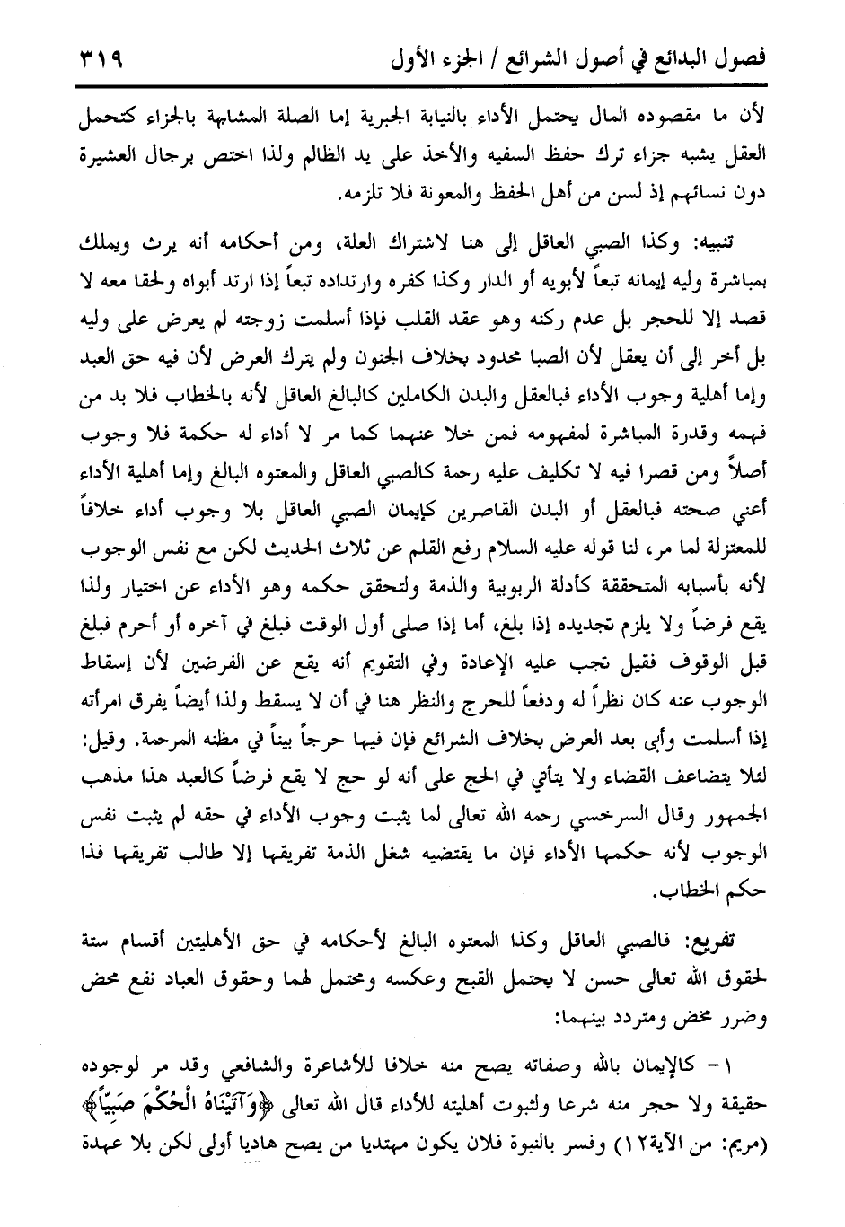 1 - كالإيمان بالله وصفاته يصح منه خلافا للأشاعرة والشافعي وقد مر لوجوده حقيقة ولا حجر منه شرعا ولثبوت أهليته للأداء قال الله تعالى {وَآتَيْنَاهُ الْحُكْمَ صَبِيًّا} (مريم: من الآية 12) وفسر بالنبوة فلان يكون مهتديا من يصح هاديا أولى لكن بلا عهدة