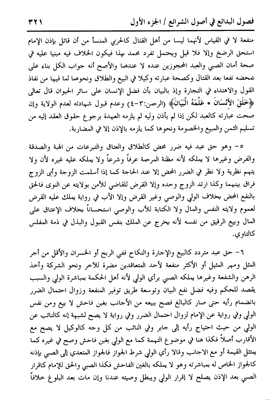 6 - حق عبد متردد كالبيع والإجارة والنكاح ففي الربح أو الخسران والأقل من أجر المثل ومهر المثيل أو الأكثر منفعة لأحد المتعاقدين مضرة للآخر ونحو الشركة وأخذ الرهن والشفعة وغيرها يملكه الصبي برأي الولي لأنه أهل الحكمة لمباشرة الولي والسبب يقصد للحكم وفيه فضل نفع البيان وتوسعة طريق توفير المنفعة وزوال احتمال الضرر بانضمام رأيه حتى صار كالبالغ فصح ببيعه من الأجانب بغبن فاحش لا بيع ومن نفس الولي وفي رواية عن الإِمام لزوال احتمال الضرر وفي رواية لا يصح لشبهة إنه كالنائب عن الولي من حيث احتياج رأيه إلى جابر وفي النائب من كل وجه كالوكيل لا يصح مع الأقارب أصلًا فكذا هنا في موضوع التهمة كما مع الولي بغبن فاحش وصح في غيره كما يمتثل القيمة أو مع الاجانب وقالا رأي الولي شرط الجواز فالجواز المتعدي إلى الصبي بإذنه كالجواز الخاص له بمباشرته وهو لا يملكه بالغين الفاحش فكذا الصبي والحق للإمام كاقرار الصبي بعد الإذن يصلح لا إقرار الولي ويبطل وصيته عندنا وإن مات بعد البلوغ خلافًا