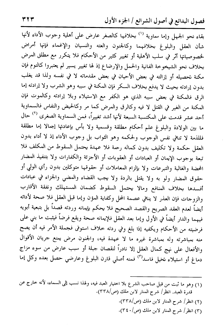 بقاء نحو الجهل وإما سماوية (¬1) بخلافها كالصغر عارض على أهلية وجوب الأداء لأنها شأن العقل والبلوغ بخلافهما وكالجنون والعته والنسيان والإغماء فإنها أمراض لخصوصياتها أثر في سلب الأهلية أو تغيير كثير من الأحكام فلا يتكرر مع مطلق المرض بخلاف نحو الشيخوخة الفانية والحمل والإرضاع إذ لها تغيير يسير لم يعتبروا كالنوم فإن مكنة تحصيله أو إزالته في بعض الأحيان في بعض مقدماته لا في نفسه ولذا قد يغلب بدون إرادته بحيث لا يدفع بخلاف السكر فإن المكنة في سببه وهو الشرب ولا إرادته إما الرق فالمكنة في بعض سببه الذي هو الكفر مع الاستيلاء وبلا إرادته وكالموت فإن المكنة من الغير في القتل لا فيه وكالرق والمرض كما مر وكالحيض والنفاس فالسماوية أحد عشر قدمت على المكتسبة السبعة لأنها أشد تغييرًا، فمن السماوية الصغرى (¬2) حال ما بين الولادة والبلوغ علم أحكام مطلقة وقسمية ولا بأس بإعادتها إجمالا إما مطلقة فللذمة لا تنافي نفس الوجوب ولحكمه وهو الثواب بل وجوب الأداء إذ لا أداء بدون العقل حكمة ولا تكليف بدون كماله رحمة فلا عهدة يحتمل السقوط من المكلف فلا تبعة بوجوب الإيمان أو العبادات أو العقوبات أو الأجزئة والكفارات ولا بتنفيذ المضار المحضة والغالبة والتبرعات ولا بإلزام المعاملات أو حقوقها متوكلين بدون رأي الولي أو حقوق المضار ولو به ولا يقتل بالردة ولا يجب القضاء والمضي والجزاء في عبادات أفسدها بخلاف المنافع ومالا يحتمل السقوط كضمان المستهلك ونفقة الأقارب والزوجات فإن العذر لا ينافي عصمة المحل وكفاية المؤن وإما قبل العقل فلا صحة لأدائه أيضًا لعدم العقد الصريح والقصد الصحيح فلا يحكم بإيمانه وردته قصدًا بل بتبعية أبويه فيهما والدار أيضًا في الأول وإما بعد العقل فلإيمانه صحة ويقع فرضًا فيثبت ما بني على فرضيته من الأحكام ويكفيه إذا بلغ وفي ردته خلاف استوفى فجملة الأمر فيه أن يصح منه بمباشرته وله بمباشرة غيره ما لا عهدة فيه، والجنون مرض يمنع جريان الأقوال والأفعال على نهج كمال العقل إلا نادرًا لنقصان جبلة أو سبب عارض من سوء مزاج دماغ أو استيلاء تخيل فاسد (¬3) فمنه أصلي قارن البلوغ وعارضي حصل بعده وكل إما