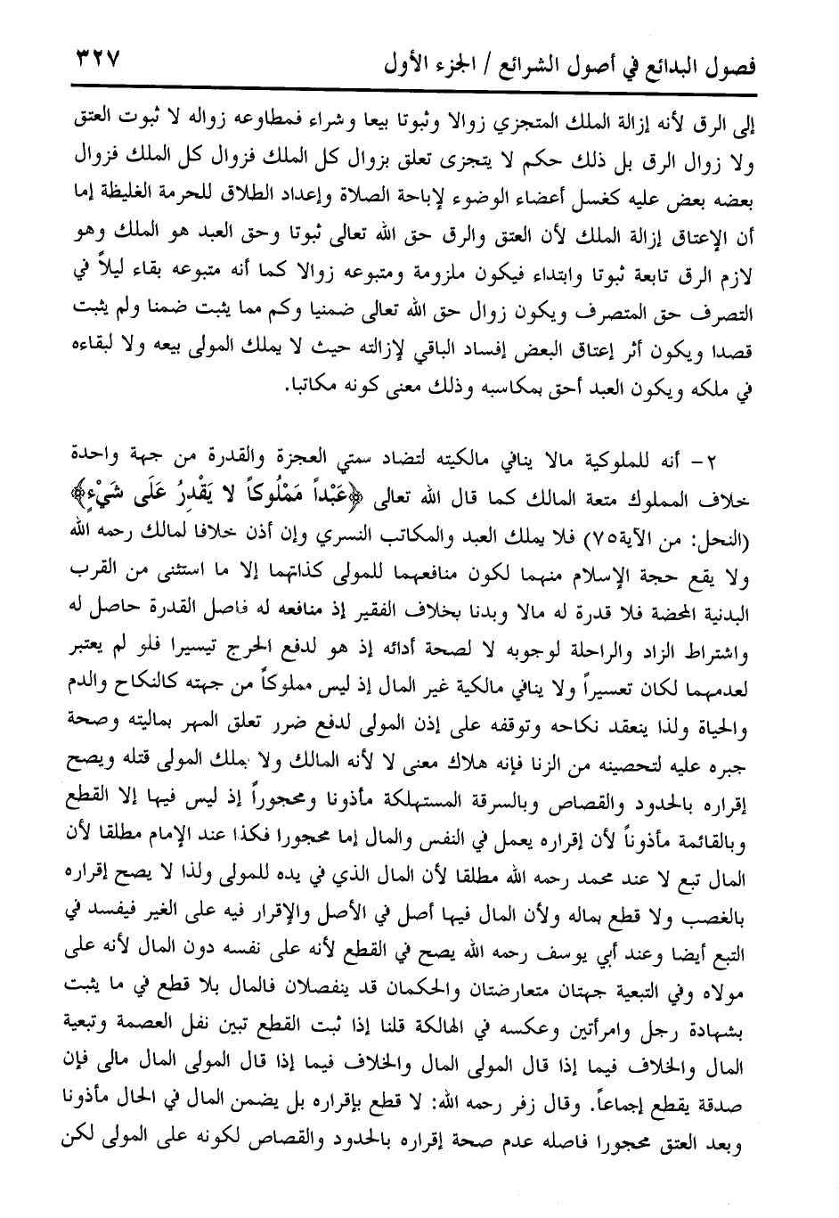 2 - أنه للملوكية مالا ينافي مالكيته لتضاد سمتي العجزة والقدرة من جهة واحدة خلاف المملوك متعة المالك كما قال الله تعالى {عَبْدًا مَمْلُوكًا لَا يَقْدِرُ عَلَى شَيْءٍ} [النحل: 75] فلا يملك العبد والمكاتب النسري وإن أذن خلافاًَ لمالك رحمه الله ولا يقع حجة الإِسلام منهما لكون منافعهما للمولى كذاتهما إلا ما استثنى من القرب البدنية المحضة فلا قدرة له مالًا وبدنا بخلاف الفقير إن منافعه له فاصل القدرة حاصل له واشتراط الزاد والراحلة لوجوبه لا لصحة أدائه إذ هو لدفع الحرج تيسيرا فلو لم يعتبر لعدمهما لكان تعسيرًا ولا ينافي مالكية غير المال إذ ليس مملوكًا من جهته كالنكاح والدم والحياة ولذا ينعقد نكاحه وتوقفه على إذن المولى لدفع ضرو تعلق المهر بماليته وصحة جبره عليه لتحصينه من الزنا فإنه هلاك معنى لا لأنه المالك ولا يملك المولى قتله ويصح إقراره بالحدود والقصاص وبالسرقة المستهلكة مأذونا ومحجورًا إذ ليس فيها إلا القطع وبالقائمة مأذونًا لأن إقراره يعمل في النفس والمال إما محجورا فكذا عند الإِمام مطلقا لأن المال تبع لا عند محمَّد رحمه الله مطلقا لأن المال الذي في يده للمولى ولذا لا يصح إقراره بالغصب ولا قطح بماله ولأن المال فيها أصل في الأصل والإقرار فيه على الغير فيفسد في التبع أيضًا وعند أبي يوسف رحمه الله يصح في القطع لأنه على نفسه دون المال لأنه على مولاه وفي التبعية جهتان متعارضتان والحكمان قد ينفصلان فالمال بلا قطع في ما يثبت بشهادة رجل وامرأتين وعكسه في الهالكة قلنا إذا ثبت القطع تبين نفل العصمة وتبعية المال والخلاف فيما إذا قال المولى المال والخلاف فيما إفا قال المولى المال مالى فإن صدقة يقطع إجماعًا. وقال زفر رحمه الله: لا قطح بإقراره بل يضمن المال في الحال مأذونا وبعد العتق محجورا فاصله عدم صحة إقراره بالحدود والقصاص لكونه على المولى لكن