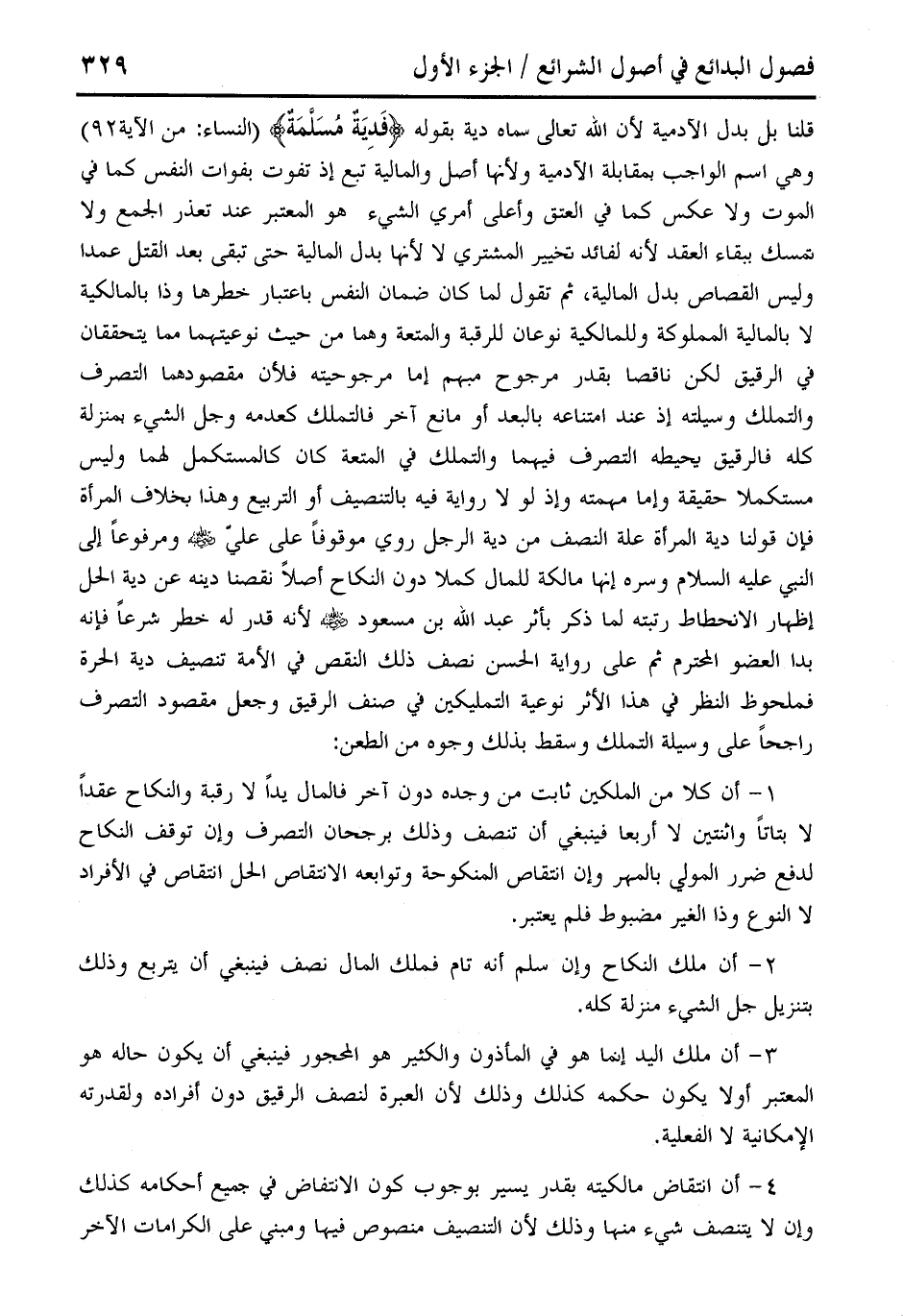 قلنا بل بدل الآدمية لأن الله تعالى سماه دية بقوله {فَدِيَةٌ مُسَلَّمَةٌ} [النساء: من الآية 92] وهي اسم الواجب بمقابلة الآدمية ولأنها أصل والمالية تبع إذ تفوت بفوات النفس كما في الموت ولا عكس كما في العتق وأعلى أمري الشيء هو المعتبر عند تعذر الجمع ولا لقسك ببقاء العقد لأنه لفائد تخيير المشتري لا لأنها بدل المالية حتى تبقى بعد القتل عمدا وليس القصاص بدل المالية، ثم تقول لما كان ضمان النفس باعتبار خطرها وذا بالمالكية لا بالمالية المملوكة وللمالكية نوعان للرقبة والمتعة وهما من حيث نوعيتهما مما يتحققان في الرقيق لكن ناقصا بقدر مرجوح مبهم إما مرجوحيته فلأن مقصودهما التصرف والتملك وسيلته إذ عند امتناعه بالبعد أو مانع آخر فالتملك كعدمه وجل الشيء بمنزلة كله فالرقيق يحيطه التصرف فيهما والتملك في المتعة كان كالمستكمل لهما وليس مستكملا حقيقة وإما مهمته وإذ لولا رواية فيه بالتنصيف أو التربيع وهذا بخلاف المرأة فإن قولنا دية المرأة علة النصف من دية الرجل روي موقوفًا على عليّ - رضي الله عنه -ومرفوعًا إلى النبي عليه السلام وسره إنها مالكة للمال كملا دون النكاح أصلًا نقصنا دينه عن دية الحل إظهار الانحطاط رتبته لما ذكر بأثر عبد الله بن مسعود - رضي الله عنه - لأنه قدر له خطر شرعًا فإنه بدا العضو المحترم ثم على رواية الحسن نصف ذلك النقص في الأمة تنصيف دية الحرة فملحوظ النظر في هذا الأثر نوعية التمليكين في صنف الرقيق وجعل مقصود التصرف راجحًا على وسيلة التملك وسقط بذلك وجوه من الطعن: