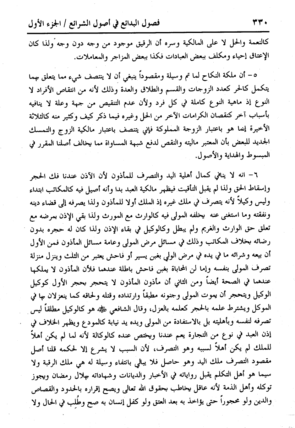 6 - انه لا ينافي كمال أهلية اليد والتصرف للمأذون لأن الاذن عندنا فك الحجر وإسقاط الحق ولذا لم يقبل التأقيت فيظهر مالكية العبد بدا وأنه أصيل فيه كالمكاتب ابتداء وليس وكيلًا لأنه يتصرف في ملك غيره إذ الملك أولًا للمأذون ولذا يصرفه إلى قضاء دينه ونفقته وما استغنى عنه يخلفه المولى فيه كالوارث مع المورث ولذا بقي الإذن بمرضه مع تعلق حق الوارث والغريم ولم يبطل وكالوكيل في بقاء الإذن ولذا كان له حجره بدون رضائه بخلاف المكاتب وذلك في مسائل مرض المولى وعامة مسائل المأذون فمن الأول أن بيعه وشرائه ما في يده في مرض الولي بغبن يسير أو فاحش يعتبر من الثلث وينزل منزلة تصرف المولى بنفسه وإما لن المحاباة بغبن فاحش باطلة عندهما فلأن المأذون لا يملكها عندهما في الصحة أيضًا ومن الثاني أن مأذون المأذون لا يتحجر بحجر الأول كوكيل الوكيل ويتحجر أن يموت المولى وجنونه مطقًا وارتداده وقتله ولحاقه كما ينعزلان بها في الموكل ويشترط علمه بالحجركعلمه بالعزل، وقال الشافعي - رضي الله عنه - هو كالوكيل مطلقًا ليس تصرفه لنفسه وبأهليته بل بالاستفادة من المولى ويده يد نيابة كالمودع ويظهر الخلاف في إذن العبد في نوع من التجارة يعم عندنا ويختص عنده كالوكالة لأنه لما لم يكن أهلًا للملك لم يكن أهلًا لسببه وهو التصرف، لأن السبب لا يشرع إلا لحكمه قلنا أصل مقصود التصرف ملك اليد وهو حاصل فلا يبالي بانتفاء وسيلة له هى ملك الرقبة ولا سيما هو أهل التكلم يقبل رواياته في الأخبار والديانات وشهاداته بهلال رمضان ويجوز توكله وأهل الذمة لأنه عاقل يخاطب بحقوق الله تعالى ويصح إقراره بالحدود والقصاص والدين ولو محجورًا حتى يؤاخذ به بعد العتق ولو كفل إنسان به صح وطُلِب في الحال ولا