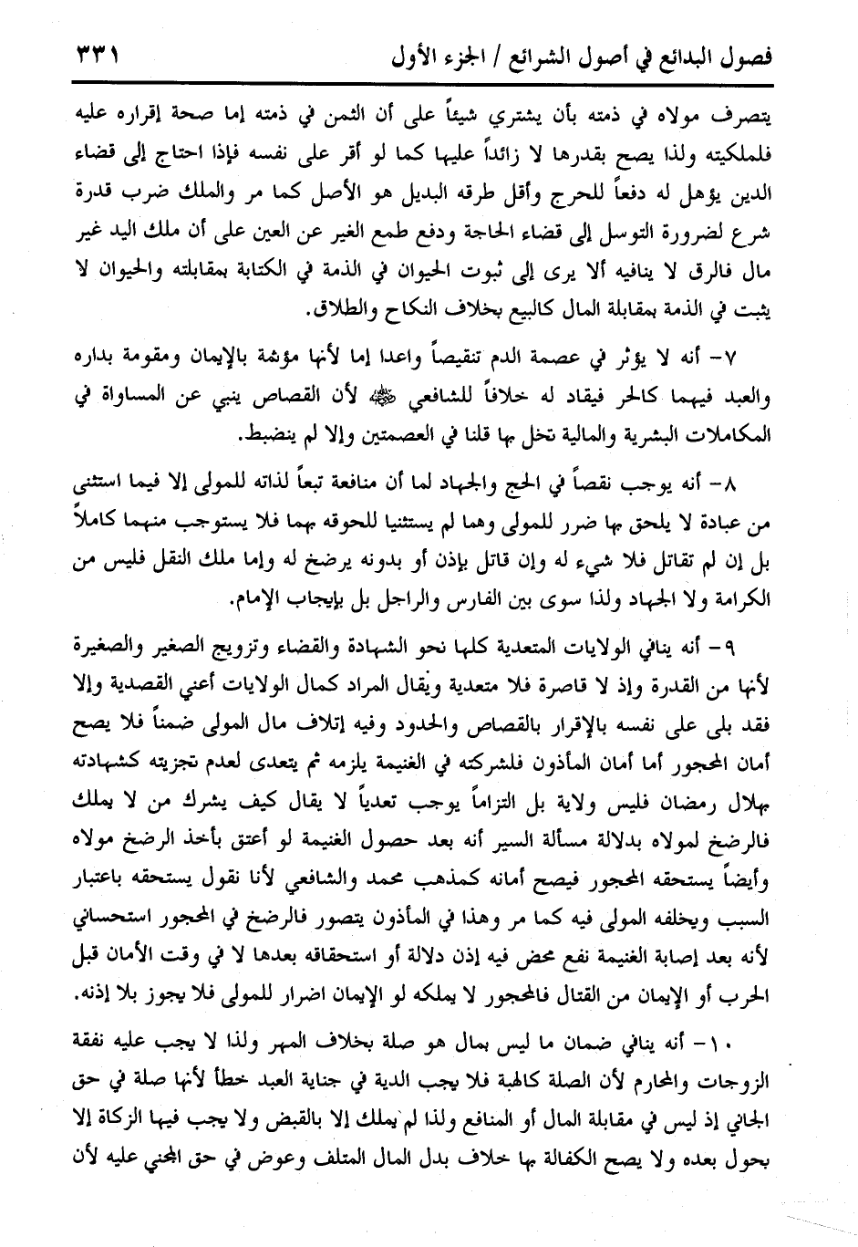 9 - أنه ينافي الولايات المتعدية كلها نحو الشهادة والقضاء وتزويج الصغير والصغيرة لأنها من القدرة وإذ لا قاصرة فلا متعدية ويقال المراد كمال الولايات أعني القصدية وإلا فقد بلى على نفسه بالإقرار بالقصاص والحدود وفيه إتلاف مال المولى ضمنًا فلا يصح أمان المحجور أما أمان المأذون فلشركته في الغنيمة يلزمه ثم يتعدى لعدم تجزيته كشهادته بهلال رمضان فليس ولاية بل التزامًا يوجب تعديًا لا يقال كيف يشرك من لا يملك فالرضخ لمولاه بدلالة مسألة السير أنه بعد حصول الغنيمة لو أعتق بأخذ الرضخ مولاه وأيضًا يستحقه المحجور فيصح أمانه كمذهب محمَّد والشافعى لأنا نقول يستحقه باعتبار السبب ويخلفه المولى فيه كما مر وهذا في المأذون يتصور فالرضخ في المحجور استحساني لأنه بعد إصابة الغنيمة نفع محض فيه إذن دلالة أو استحقاقه بعدها لا في وقت الأمان قبل الحرب أو الإيمان من القتال فالمحجور لا يملكه لو الإيمان اضرار للمولى فلا يجوز بلا إذنه.